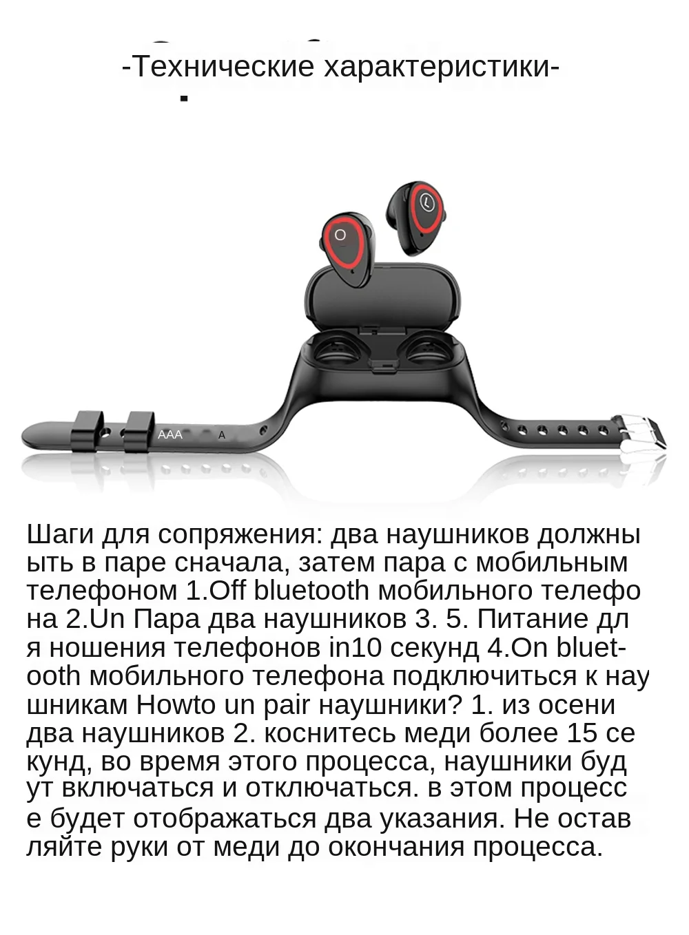 1. Убедитесь, что гарнитура выключена. Процедура выключения: Наденьте гарнитуру на ухо, нажмите и удерживайте сенсорный экран гарнитуры в течение 10 секунд, пока не услышите сообщение о выключении 2. Четкая запись сопряжения, шаги: Положите наушники на ухо, нажмите и удерживайте сенсорный экран наушников в течение 15 секунд, четкое сопряжение завершено после двух выключений звуковых сигналов. 3. Поместите гарнитуру в часы 4. Выньте наушник из часов и положите его на ухо. На данный момент, наушники будут иметь мощность-в тон. 5. Включите телефон Bluetooth, найдите Bluetooth, соответствующий гарнитуре, и подключите (последняя буква названия Bluetooth гарнитуры-«L»). После завершения сопряжения в настройках телефона будет отображаться «подключенный». Примечание: после того, как гарнитура успешно соединена, поместите ее обратно в часы, затем снимите гарнитуру с часов, и она автоматически включится и автоматически подключится. В случае, если телефон имеет ручной отключиться, вам будет нужно подключать его в настройки Bluetooth вашего телефона.