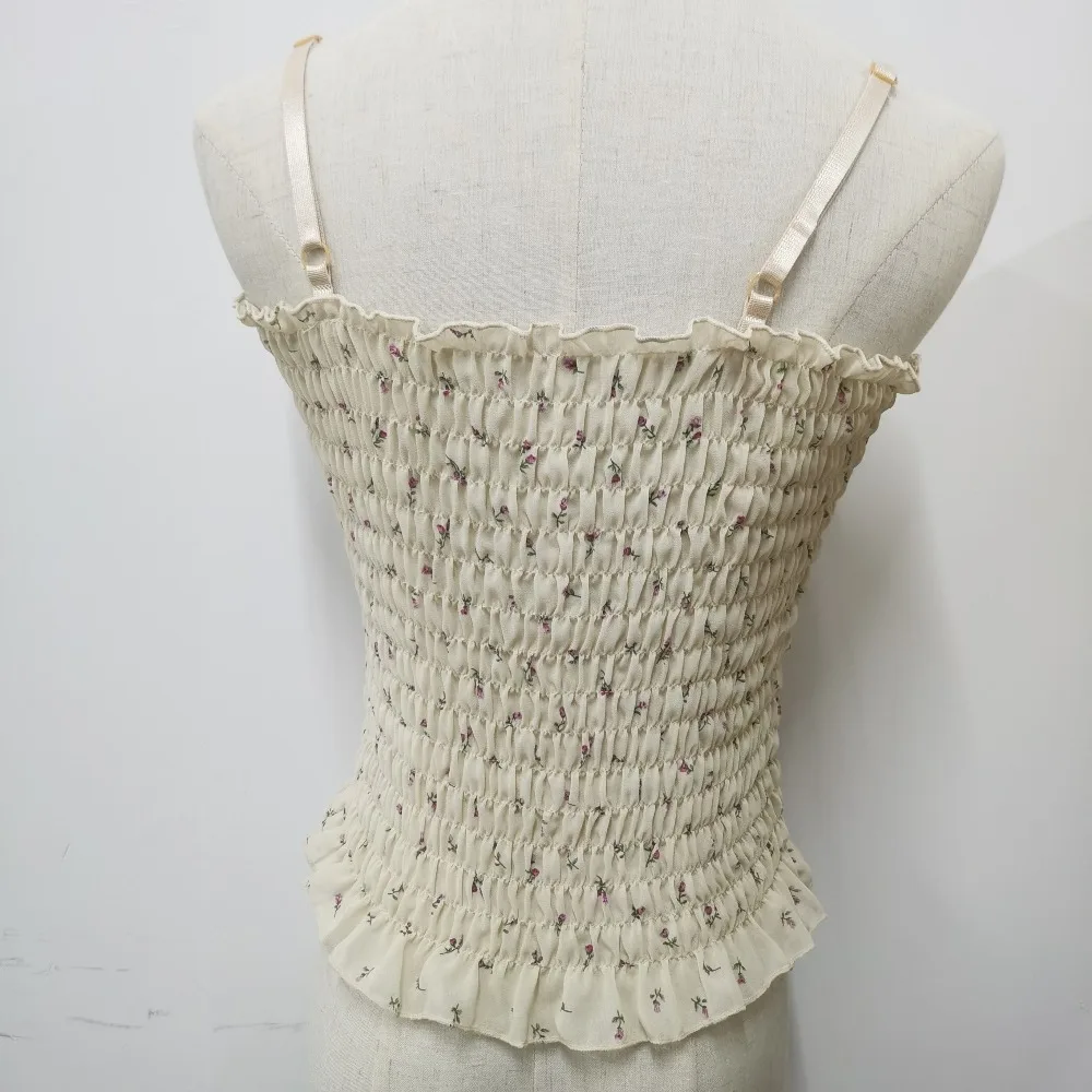 Женская плиссированная майка с цветочным принтом, тонкий жилет в Корейском стиле с рюшами, милые лямки с открытой спиной для девочек, лето 2020