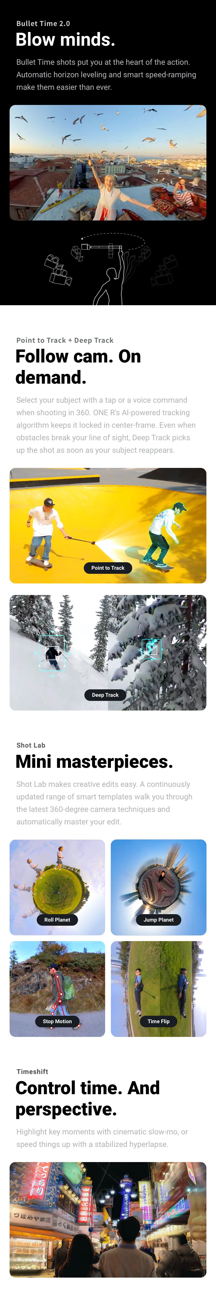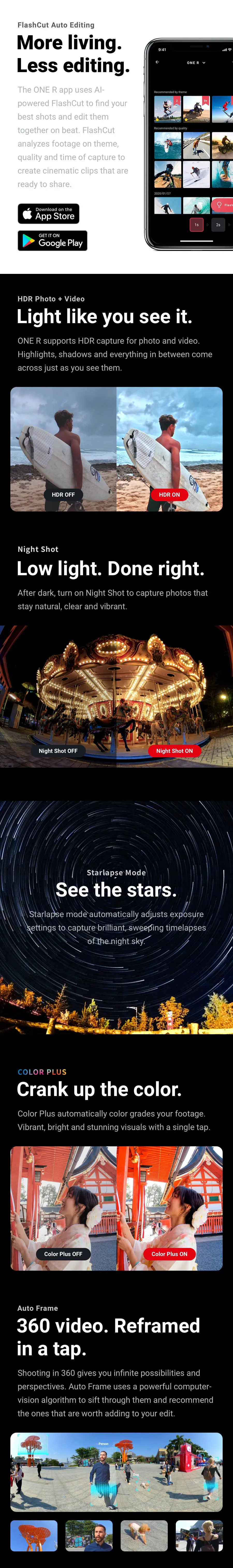 4K издание включает в себя 1x4K широкоугольный мод, 1x ядро, 1x основание батареи и 1x Монтажный кронштейн. Двойной выпуск включает в себя 1x4K широкоугольный мод, 1x двойной объектив 360 мод, 1x ядро, 1x основание батареи, 1x крышка объектива и 1x Монтажный кронштейн. 360 издание (скоро) включает в себя 1x двойной объектив 360 мод, 1x ядро, 1x основание батареи, 1x крышка объектива и 1x Монтажный кронштейн. 1-дюймовое издание (скоро) включает 1 дюйм широкоугольный мод, 1 ядро, 1 аккумулятор и 1 монтажный кронштейн.