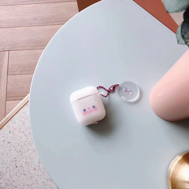 Застенчивый розовый чехол с улыбающимся лицом и голубыми глазами AirPods, соответствующий тому же украшению, матовый белый цвет, мягкий и скользкий на ощупь