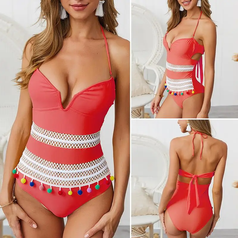 Купальник женский черный кружевной с воланом открытыми плечами в летнем