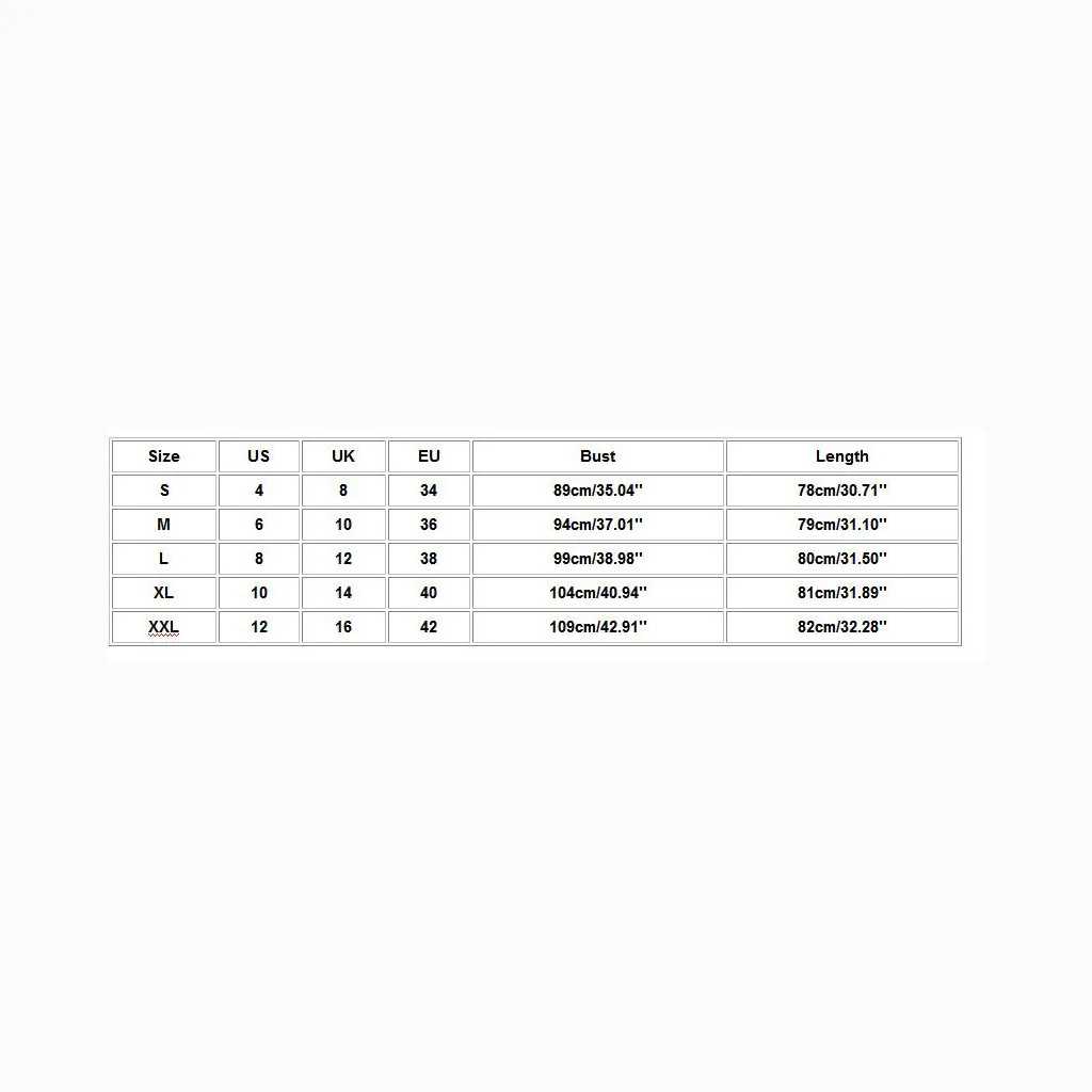 | Размеры: XXL | Свяжитесь с нами: 12 | Великобритания: 16 | ЕС: 42 | Бюст: 109 см/42,91 дюйма | Длина: 82 см/32,28 дюйма |