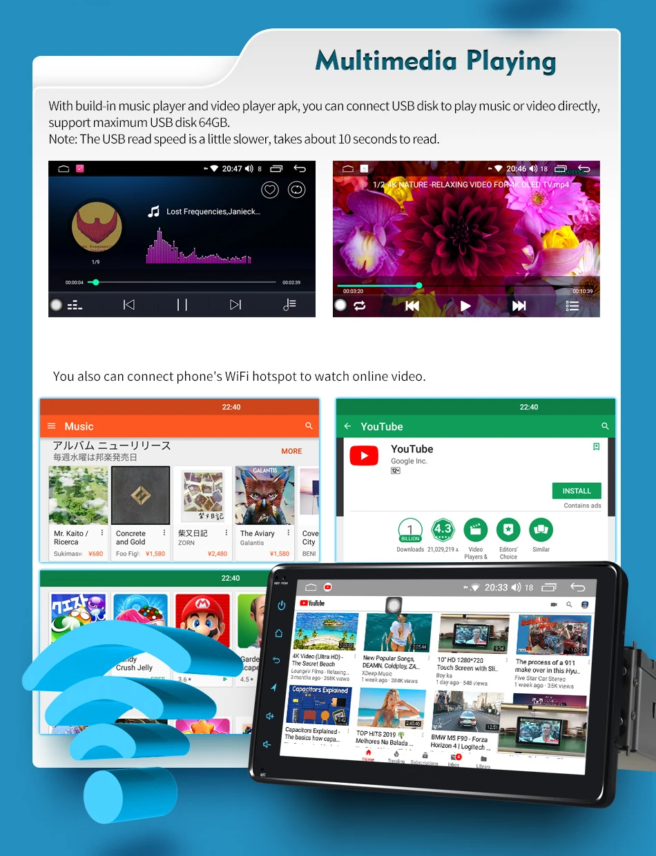 Более приятным-со встроенным музыкальным проигрывателем и видеоплеером APK, вы можете подключить usb-диск для воспроизведения музыки или видео напрямую. Этот блок поддерживает usb-диск maximun 64 Гб. Примечание: 1) Скорость чтения USB немного медленная-для считывания содержимого USB требуется около 10 с. 2) Подключение Wi-Fi точки доступа к мобильному телефону для просмотра онлайн-видео.