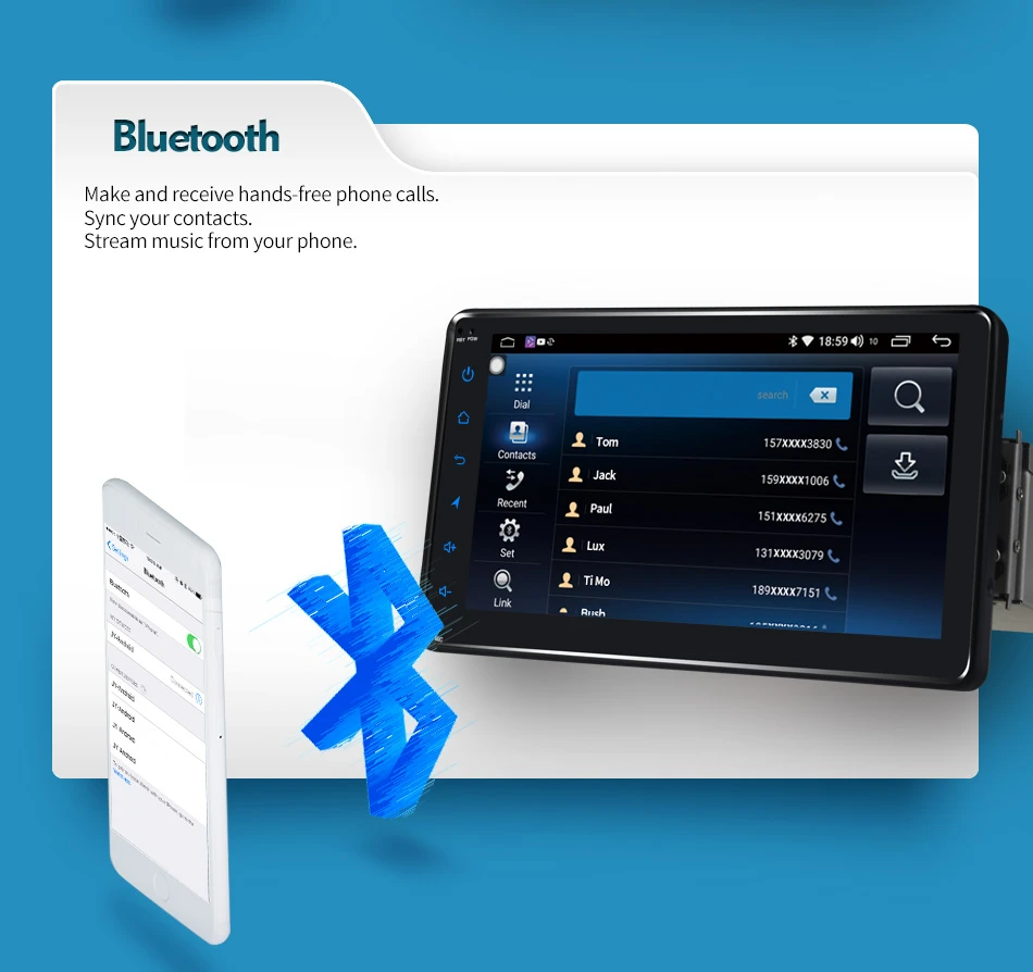 Беспроводная Синхронизация-более стабильная синхронизация музыкального проигрывателя, телефонной книги и поиск контактов по bluetooth. Примечание: 1) Встроенный микрофон 2) Внешний микрофон входит в комплект поставки товара. 3) Пароль Bluetooth: 0000