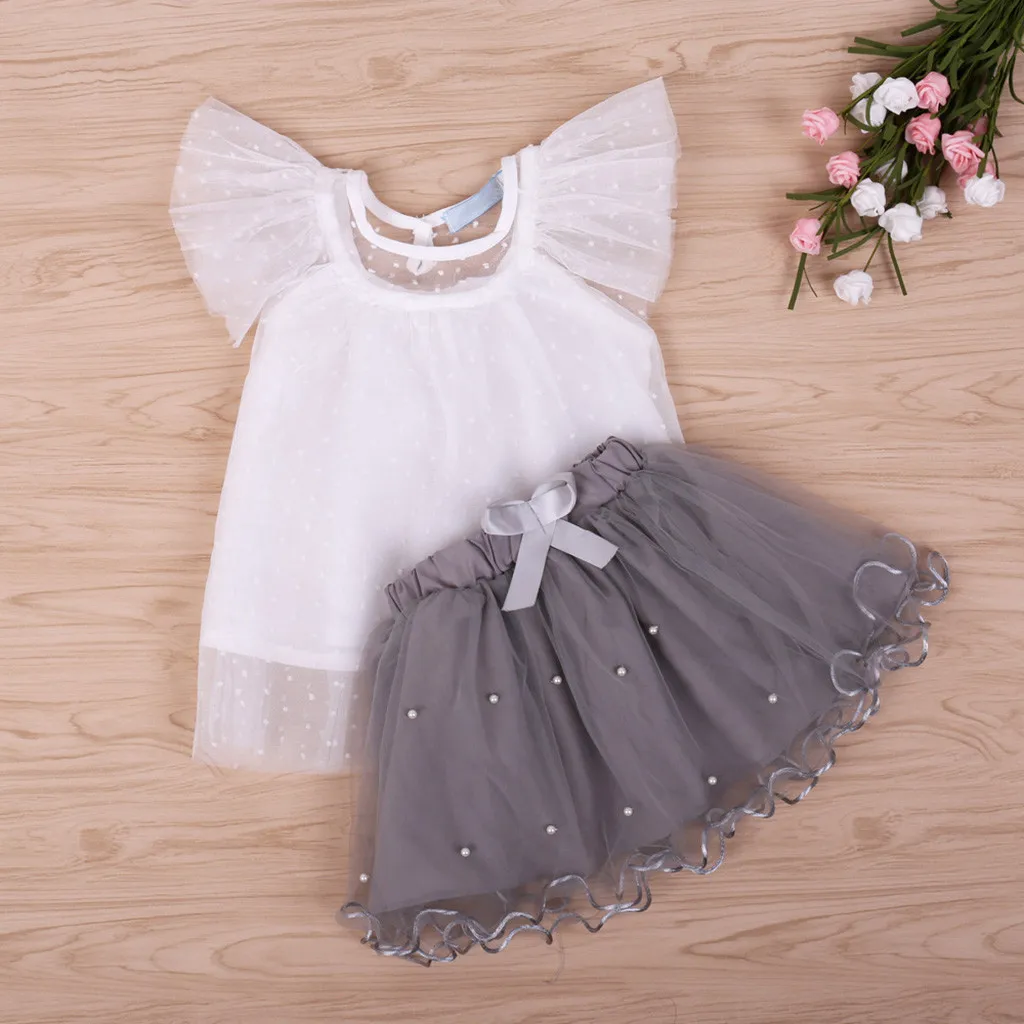Комплект одежды для маленьких девочек, футболка в горошек + короткая юбка из тюля с жемчугом