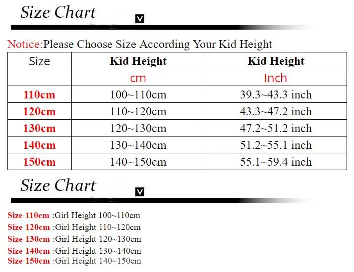 Примечание по размеру: Возраст в таблице размеров указан только для справки! Размеры в основном соответствуют росту детей. Пожалуйста, измерьте рост вашего ребенка и сравните его с таблицей размеров, чтобы выбрать размер. Если вы полны, пожалуйста, выберите на 1 или 2 размера больше. Например: рост девочки: 124 см Если размер тонкий или нормальный, пожалуйста, выберите размер 130; Если он толстый, пожалуйста, выберите размер 140