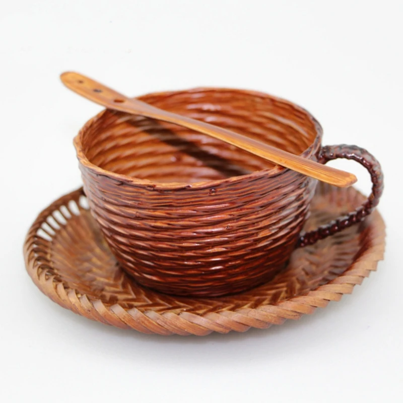 Винтажная бамбуковая чашка, плетеная непроницаемая кофейная кружка, набор с тарелкой и ложкой #0703