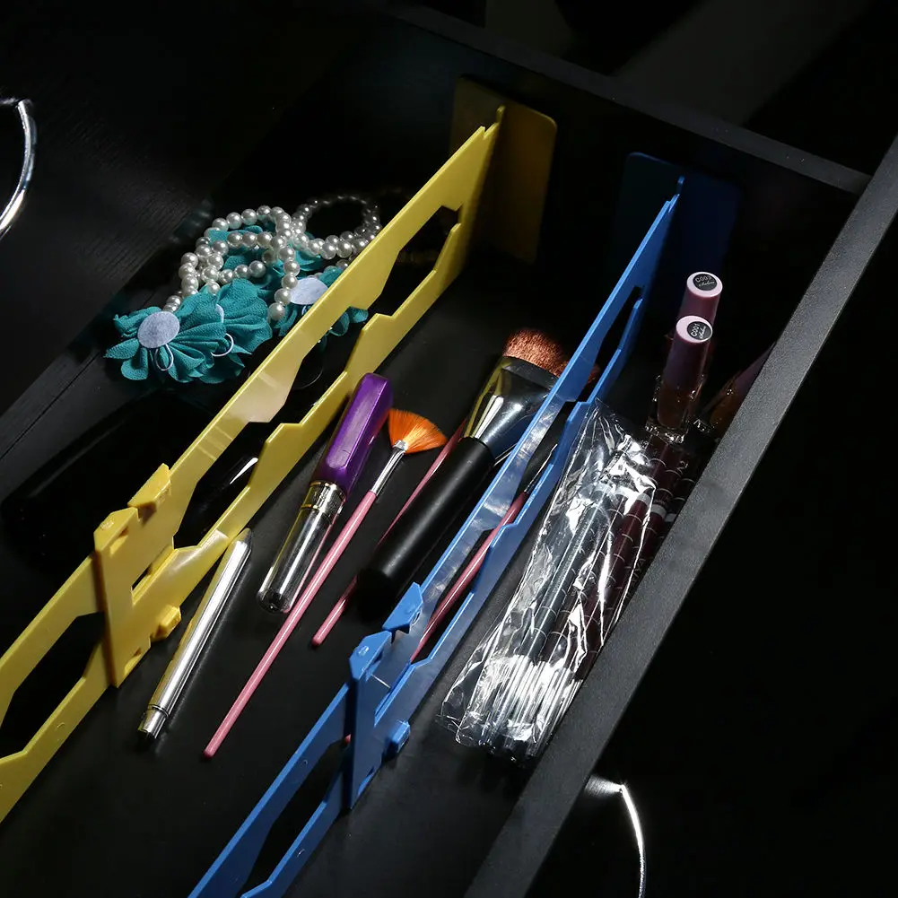 Наш Разделитель-отличное решение для организации ящика на вашей кухне, спальне, ванной, офисе и т. д., это может сделать ваш ящик действительно чистым и аккуратным. Ее высота составляет 3,5 дюйма, и его длина может регулироваться от 12,8 дюймов до 21,7 дюймов, для того, чтобы соответствовать большинству ящиков. Он также может быть легко установлен и перемещен без каких-либо повреждений вашего ящика. 5 различных цветов могут быть для вас на выбор, так чего вы ждете? Такой практичный и приятный разделитель, стоит купить!