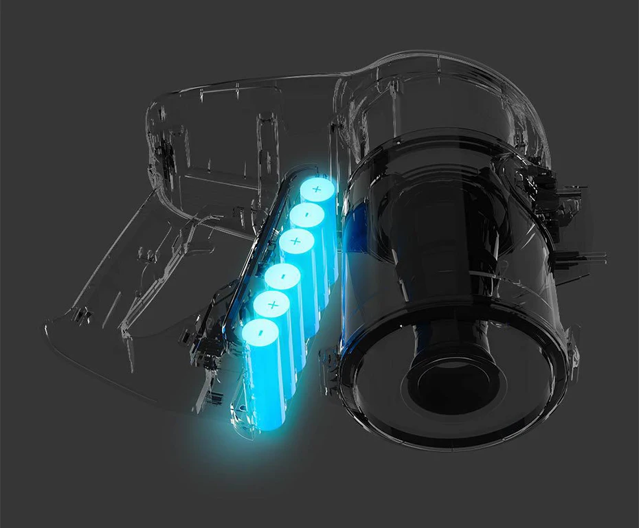 Аккумуляторная батарея состоит из шести разделов 2,5 Ач литиевых батарей, которые обеспечивают 54Wh мощности и могут заряжаться отдельно. Он может прослужить в течение 45 минут в стандартном режиме, и площадь очистки может достигать 350 квадратных метров