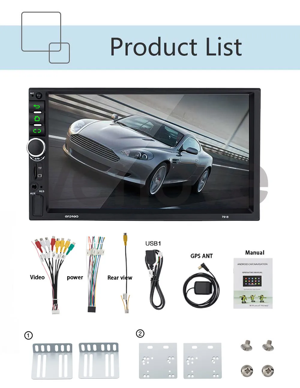 Автомобильный мультимедийный плеер 1 шт. Кабель питания 1 шт. GPS-антенна 1 шт. 1 x вход для камеры Вход и выход RCA 1 шт. 2 x USB кабель 1 х Инструкция по эксплуатации