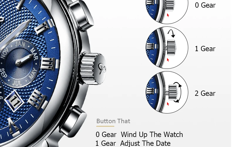 О Настройка даты 1:Регулировка времени до 6 или 6; затемРегулировка даты и недели; 2:Корректировка даты и недели до дня (например: сегодня-26-й, вы должны отрегулировать время до 25-й среды); 3:Поверните головку по часовой стрелке, чтобы сделать часовую стрелку до 12 часов. Вы можете увидеть движение даты на следующую дату (если дата не изменяется, вы должны повернуть снова);