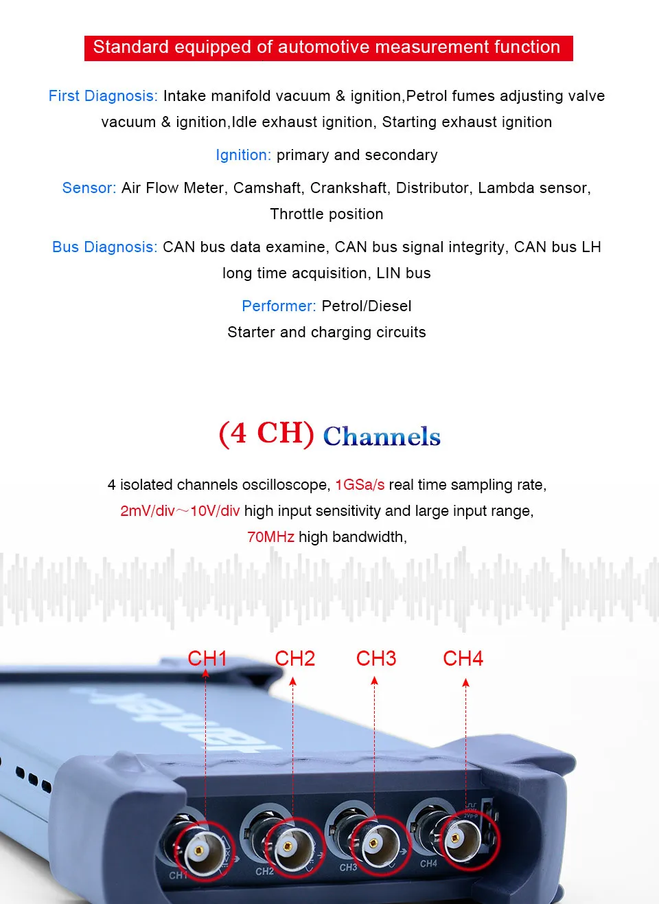 Стандарт оснащен более чем 80 типами автомобильных измерительных функций (действие зажигания/датчик/Диагностика автобуса/исполнитель/запуск и зарядка); Интерфейс USB 2,0 подключи и работай, и нет необходимости в дополнительном источнике питания; поддержка планшетного ПК; Поддержка WIN10/WIN8/WIN7 и т. Д. бесплатное программное обеспечение постоянно обновляется, высокая производительность; Поддержка USBXI, простота в эксплуатации. 4 изолированных канала осциллографа, 1 gsa/s частота дискретизации в реальном времени, 2 мВ-10 В/DIV Высокая Входная чувствительность и большой входной диапазон, 70 МГц высокая полоса пропускания, малый размер, легко носить с собой. Динамическое отслеживание курсора, запись сигнала и функция воспроизведения.