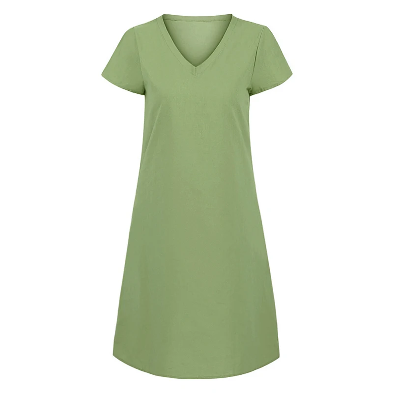 Это повседневное свободное платье в стиле бохо станет чем-то особенным в этом сезоне. Модель однотонного цвета с v-образным вырезом, короткими рукавами и длиной до колена. Идеально сочетается с ожерельем в этническом стиле.