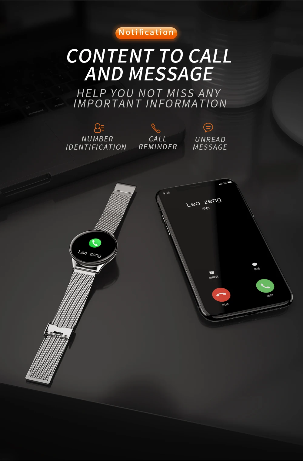 sports, make your exercise more scientific and effective. Call reminder When a call or a message is coming, the watch will remind you via vibration, never miss any