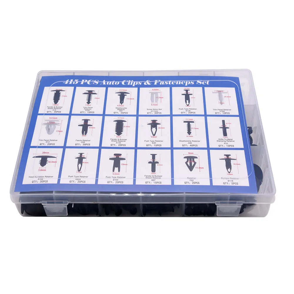 -Материал: Пластик -Количество: 415 шт + Инструменты -Цвет: черный или белый (по желанию) -Подробный размер: как показано на картинке -Установка: для Ford и большинства других автомобилей марки -Условия: 100 абсолютно новых и высококачественных Применение: широко используется для автомобильного бампера, боковой юбки, Радиаторного щита, фиксаторов, решеток, крышки двигателя, отделки дверей, различных отделочных панелей и т. Д.