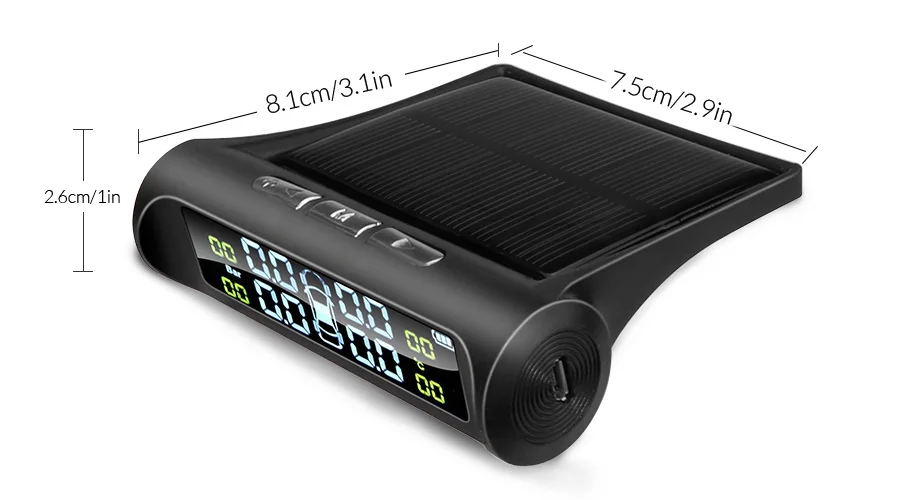 Характеристики и функции: -Зарядка от солнечной энергии, не нужно заряжать при подключении автомобильного прикуривателя -Цветной ЖК-дисплей с цифровым дисплеем, четкий, чтобы показать информацию о шинах -Контроль давления и температуры 4 шин -Низкое давление воздуха/высокая температура сигнализации -Высокая температура/утечки/Низкий сигнал тревоги батареи -Интеллектуальная ударная загрузка при движении автомобиля, не нужно включать/выключать -Беспроводное подключение с помощью датчиков, простая установка -Встроенные датчики и внешние датчики, удовлетворяют все ваши потребности -Freescale chip датчики и подходят почти на 98% автомобилей на рынке Встроенный датчик (Опционально): -Пожалуйста, установите в профессиональный Автомобильный Центр -Более стабильная и точная -Против высокой температуры и холода -IP67 защиты/Водонепроницаемый -Рабочая температура:-40 ℃-125℃ -Срок службы аккумулятора: 5 лет Внешний Сенсор (Опционально): -Легко установить, удобно заменить -Пыленепроницаемый/водонепроницаемый/Противоугонный -Против высокой температуры и холода -IP67 защиты/Водонепроницаемый -Рабочая температура:-20 ℃-80 ℃ -Срок службы батареи: 2 года, сменный,Бесплатные 4 резервных аккумулятора, срок службы внешних датчиков ≥другие продукты * 2 (4 резервных аккумулятора для K01 K04 K07 K09)