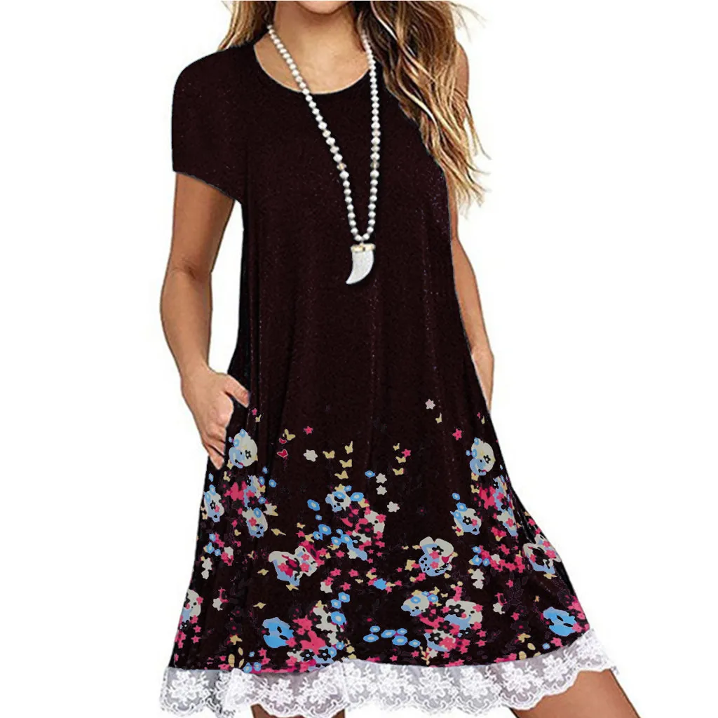 Женское повседневное кружевное мини-платье с круглым вырезом и принтом, свободные вечерние платья с короткими рукавами