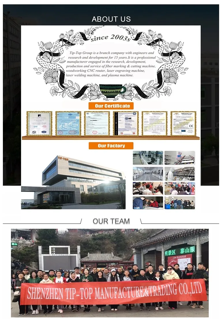 Наша компания Шэньчжэнь Tip-Top Manufacture & Trading co., LtdЯвляется филиалом компании с инженерами и исследованиями и разработками в течение 16 лет. Это профессиональный производитель, занимающийся исследованиями, разработками, производством и обслуживанием волоконно-лазерной маркировочной машины. волоконно-резательная машина, волоконно-маркировочная машина, фрезерный станок с ЧПУ, лазерная гравировальная машина, лазерная сварочная машина и машина плазменной резки.