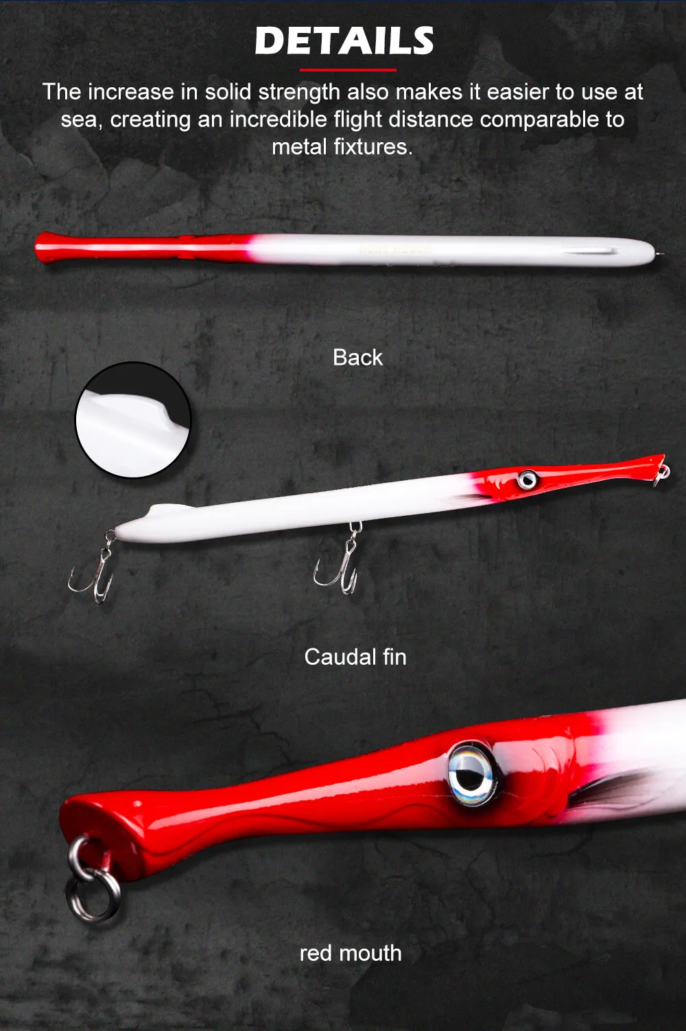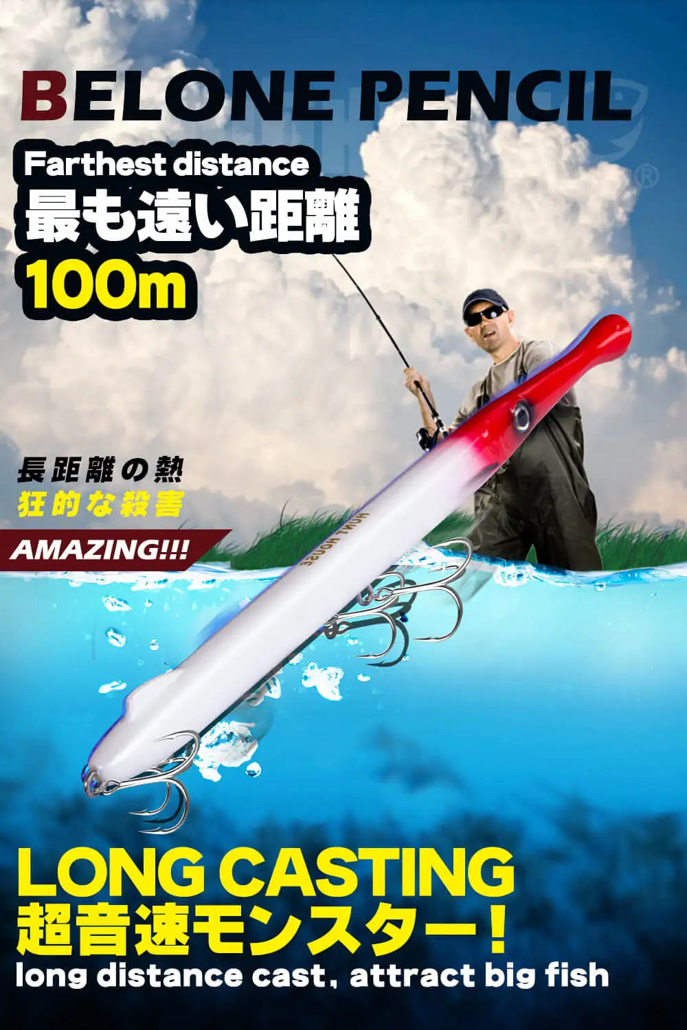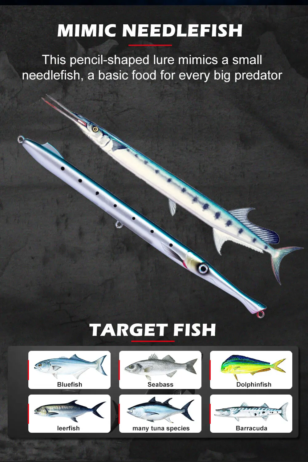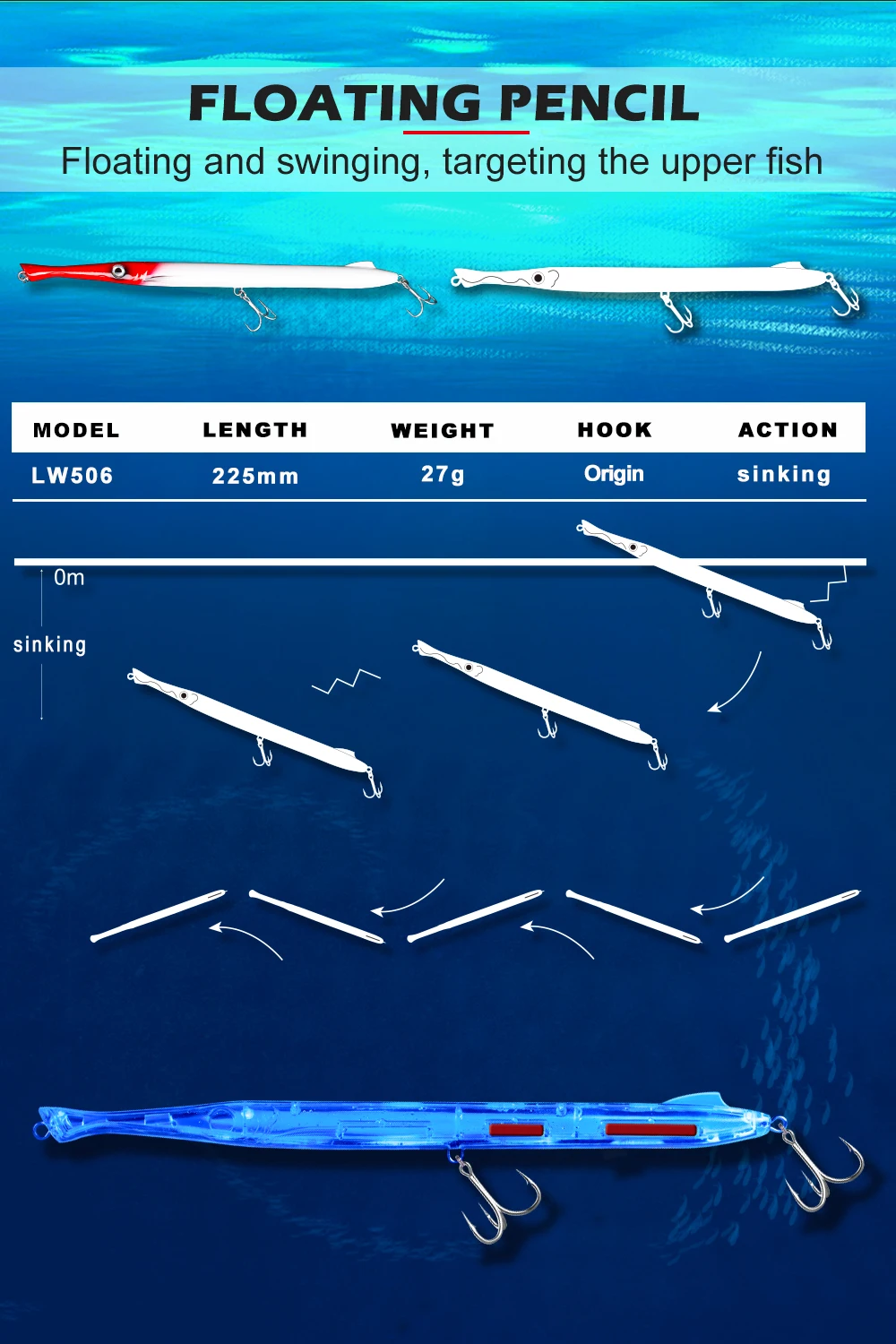 Эта приманка в форме карандаша имитирует маленькую рукодельную рыбку, базовую еду для каждого крупного хищника (голубика, лиловая рыба, морская чаша, барракудемедитерранская подводная рыба, меч-рыба, Тунни, Амберджек, дентекс, длинный тунец на Троллинг, морские басы, Махи, домкраты, queenfish, kingfish и т. д.). Стандартная версия 27g опускается и помогает рыболову гоняться за хищниками на разных этапах по водной колонне во время работы образца с несколькими действиями и шагами. Это очень эффективная приманка во время рыбалки медленно, а также быстро и яростно.