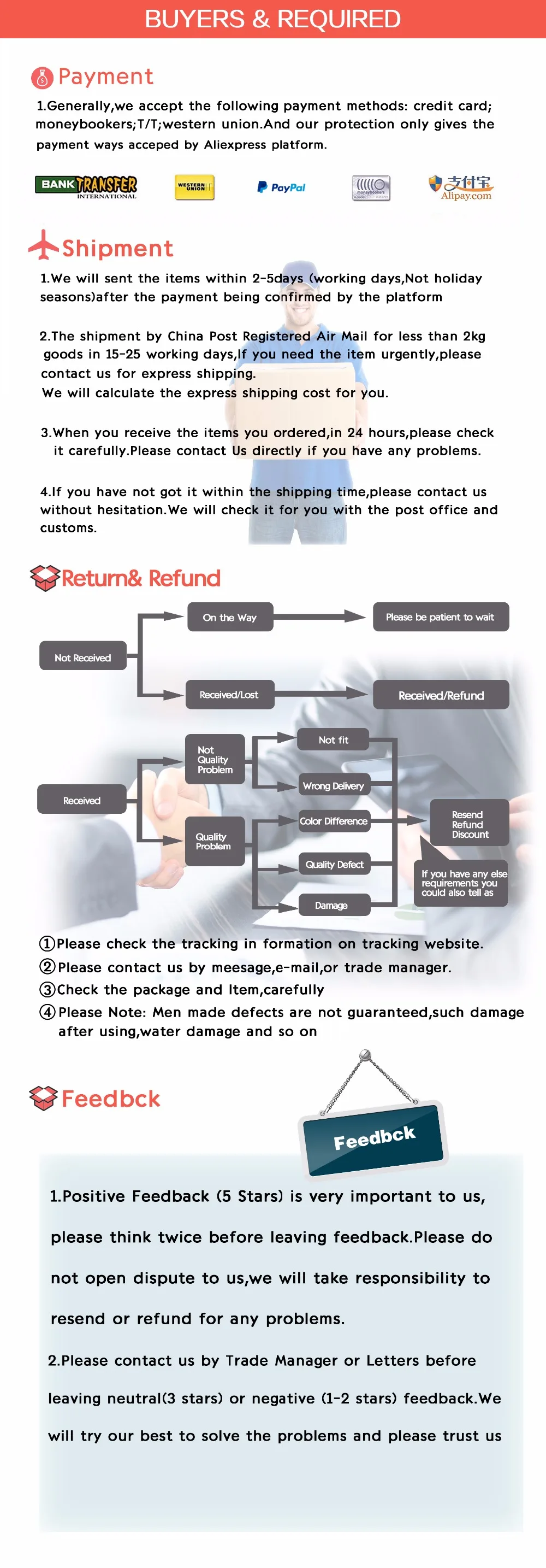 1. Если вы хотите разместить оптовый заказ, мы можем предложить вам хорошую оптовую цену! 2. Если у вас есть какие-либо вопросы, пожалуйста, дайте нам знать, вы можете связаться с нами с TradeManager. email. message. ... Мы всегда здесь! 3. Из-за различных партий продукции и неизбежной разницы настроек монитора, цвета, показанные на фотографиях, могут не на 100% соответствовать тем, которые на изделиях.