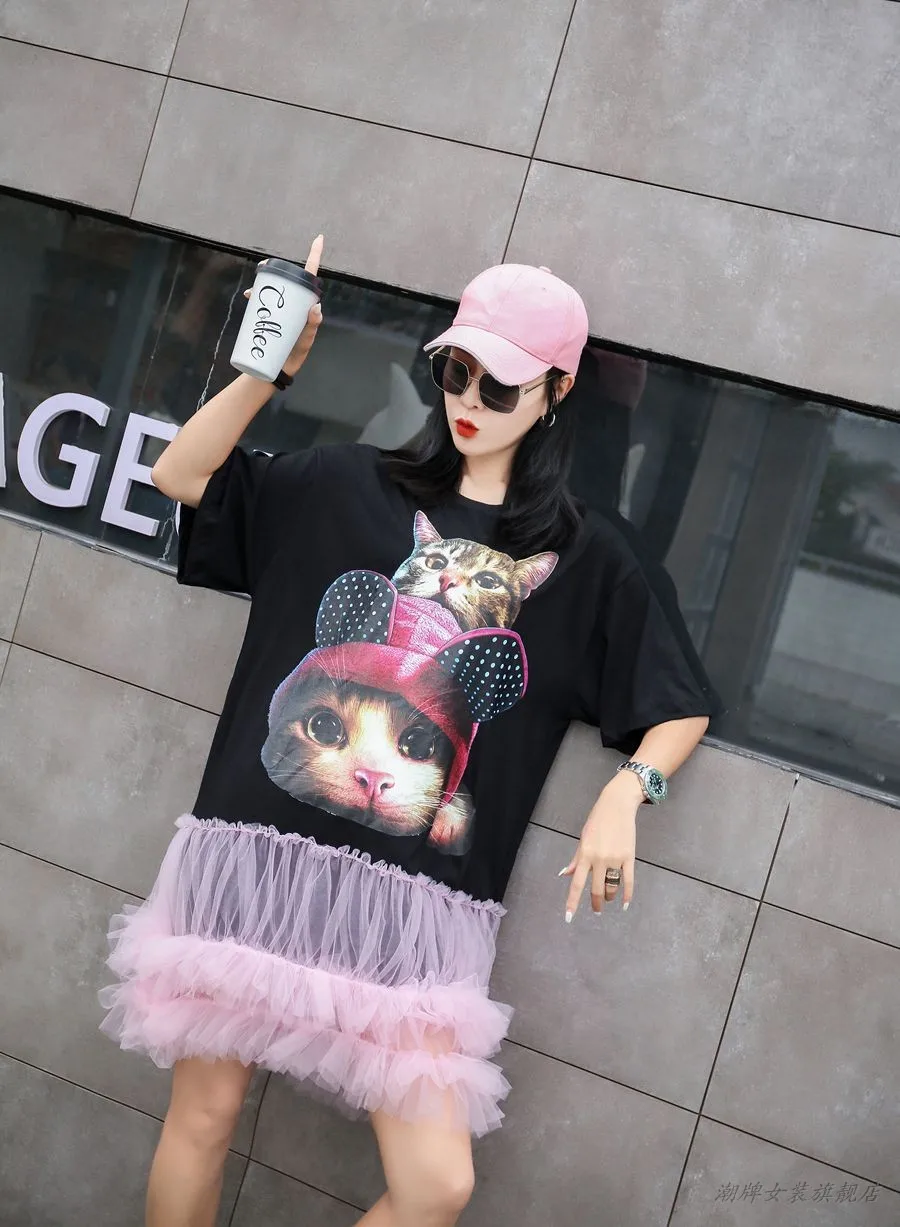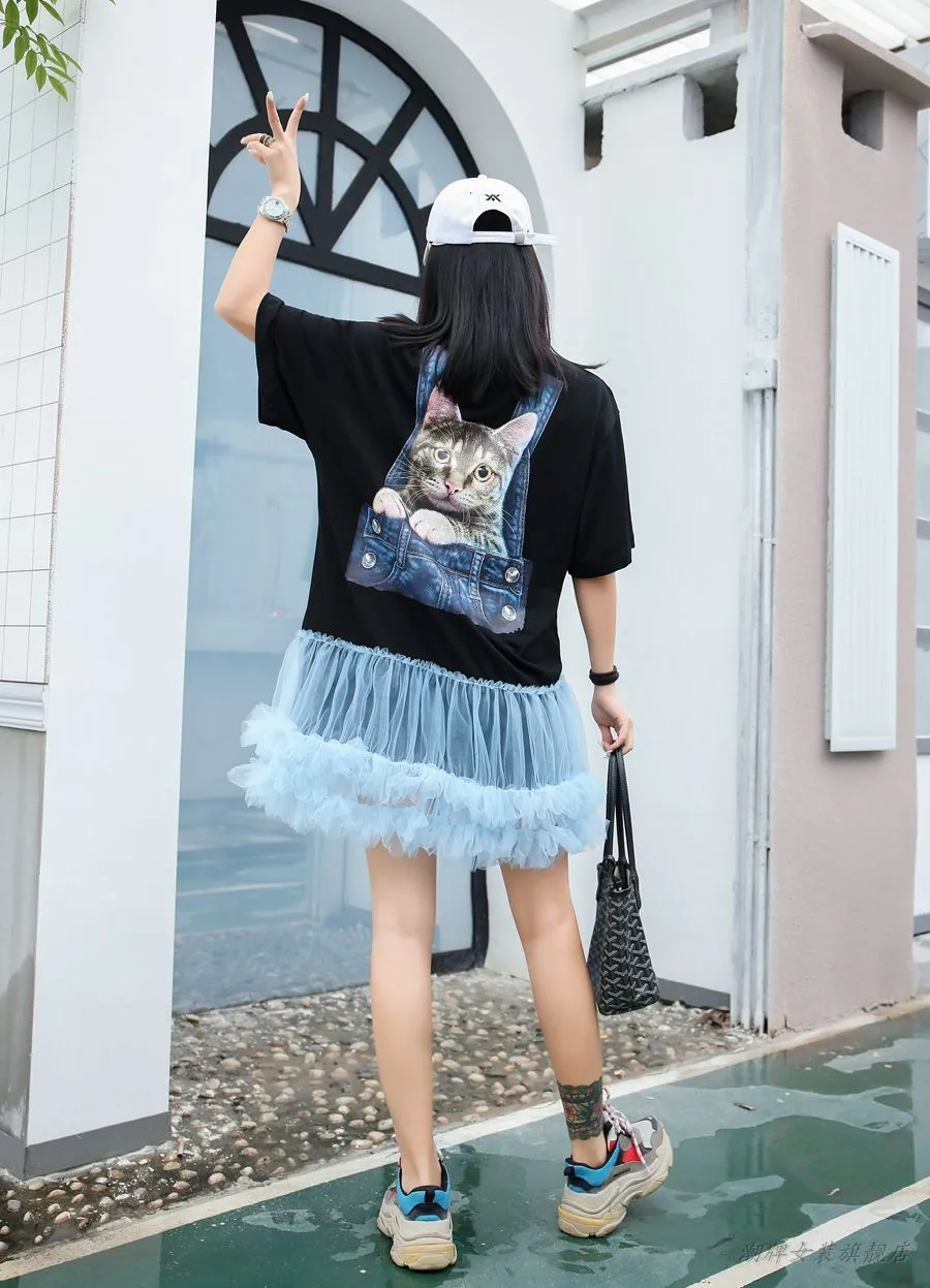Vefadisa голубое Розовое женское лоскутное Сетчатое платье женское платье с принтом кота