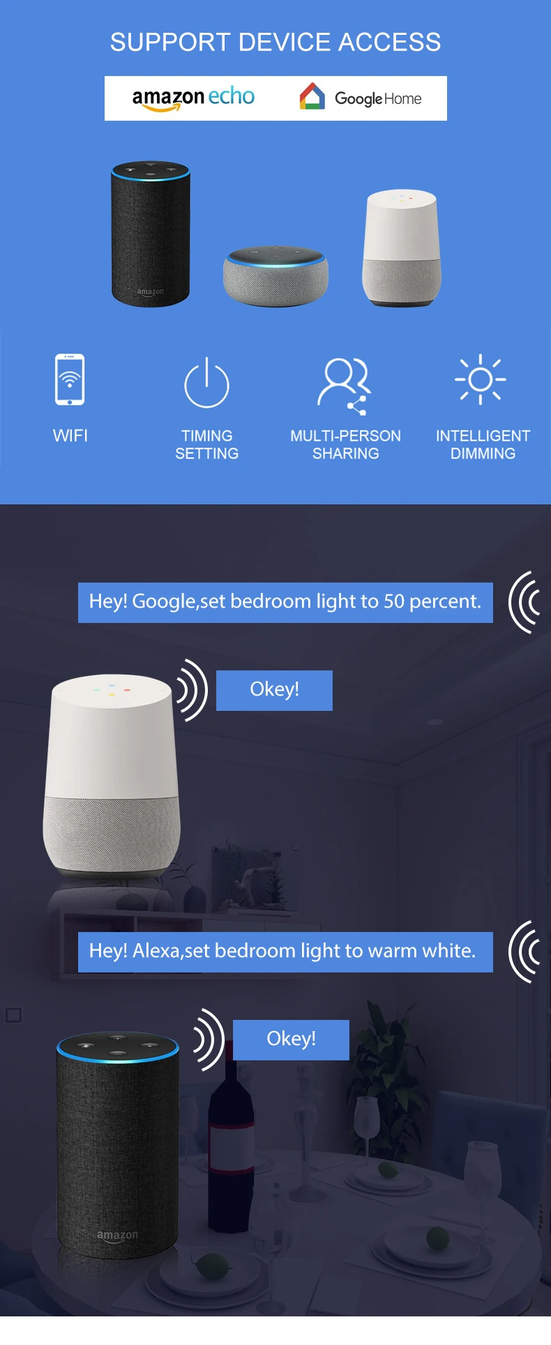 1. "Warm white" not have remote control and APP RGB dimming. 2. "Cool white" not have remote control and APP RGB dimming. 3."Remote Dimming" have remote control and RGB,but not have APP Bluetooth. 4."APP RGB" have remote control and APP Bluetooth dimming. 5. "WiFi RGB with AI": Use WiFi to connect to Amazon echo, Google home, use voice control to turn on the lights, turn off the lights, and color temperature.