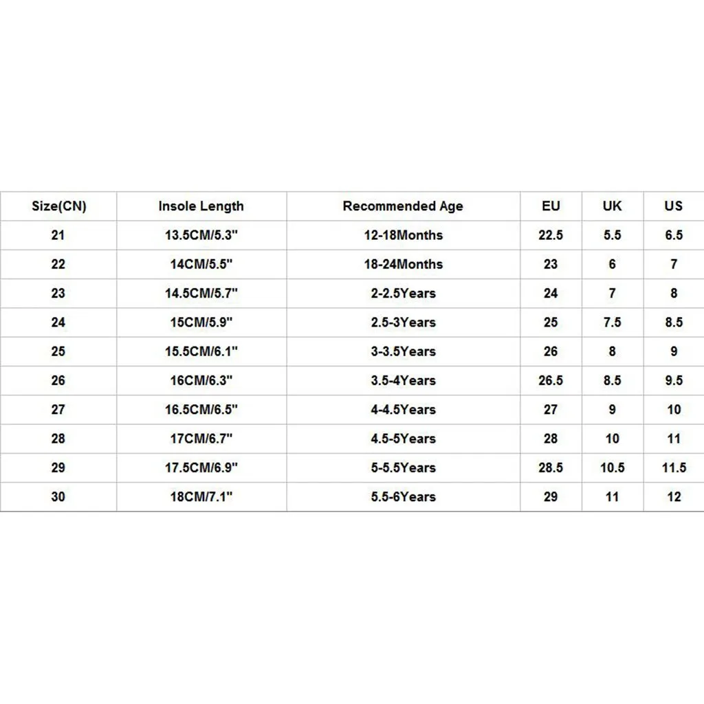 | Размер (CN): 21 | Длина стельки: 13,5 см/5,3" | Рекомендуемый возраст: 12-18Months | ЕС: 22,5 | Великобритания: 5,5 | США: 6,5 |