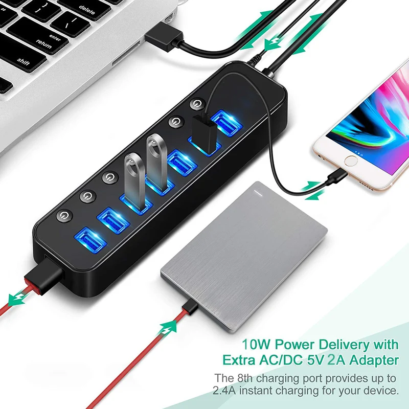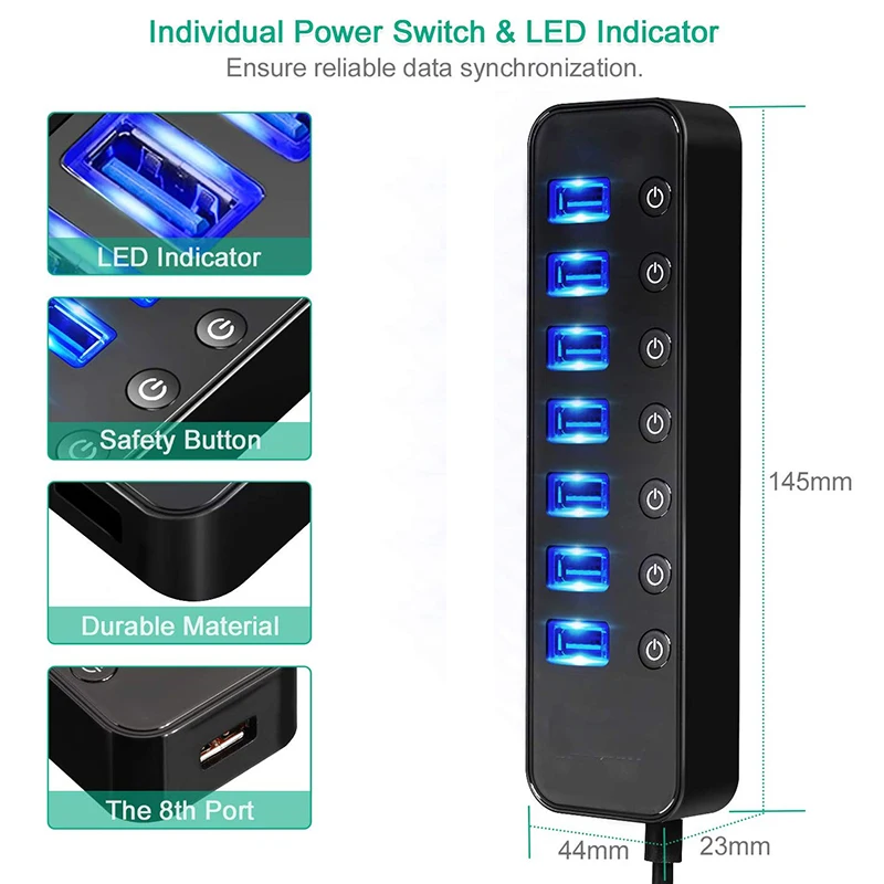 2. индивидуальными переключателями: Этот 7 портов USB hub Встроенный включения и выключения выключатели со светодиодными индикаторами для каждого порта, будучи в состоянии, чтобы включить или выключить отдельный USB порт без отключения оборудования, синие светодиодные фонари позволяют легко узнать рабочий статус, каждый переключатель запоминает настройки включения/выключения
