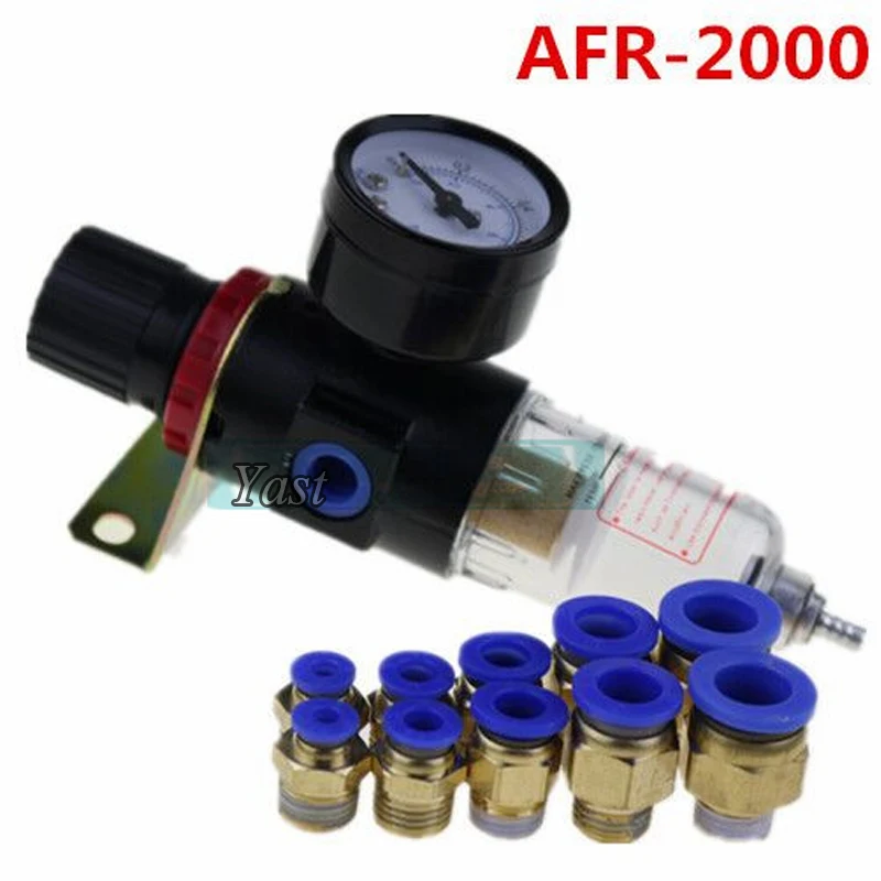 AFR-2000 регулятор воздушного фильтра, компрессор и редукционный клапан + быстрый разъем + датчик Описание: Компрессор воздушного фильтра 1/4 дюйма В комплекте с манометром и монтажным кронштейном Нить для трубы: G 1/4 дюйма Номинальный поток: 2000 л/мин Долговечное давление: 1,5 МПа Температура жидкости: 5 - 60 дегк Макс. Пресс: 0,99 МПа Диапазон давления: 0,05-0,85 МПа