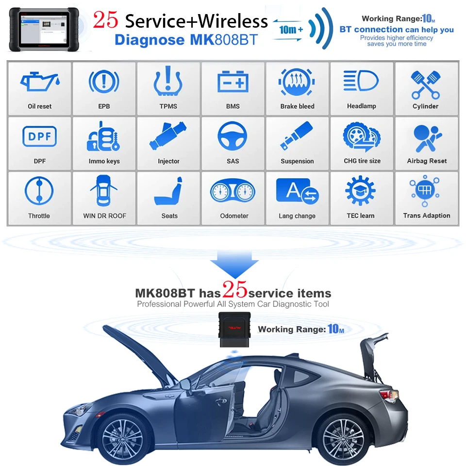 MK808BT автомобильный диагностический инструмент может выполнять 25 сервисных услуг, включая сброс масла, сброс EPB, сброс SAS, регенерацию DPF, регистрация батареи, сброс дроссельной заслонки, АБС-изгиб, Кодирование инжектора, ключ IMMO (добавить новые ключи, обучение клавишам, отключение потерянных ключей) и т. Д.
