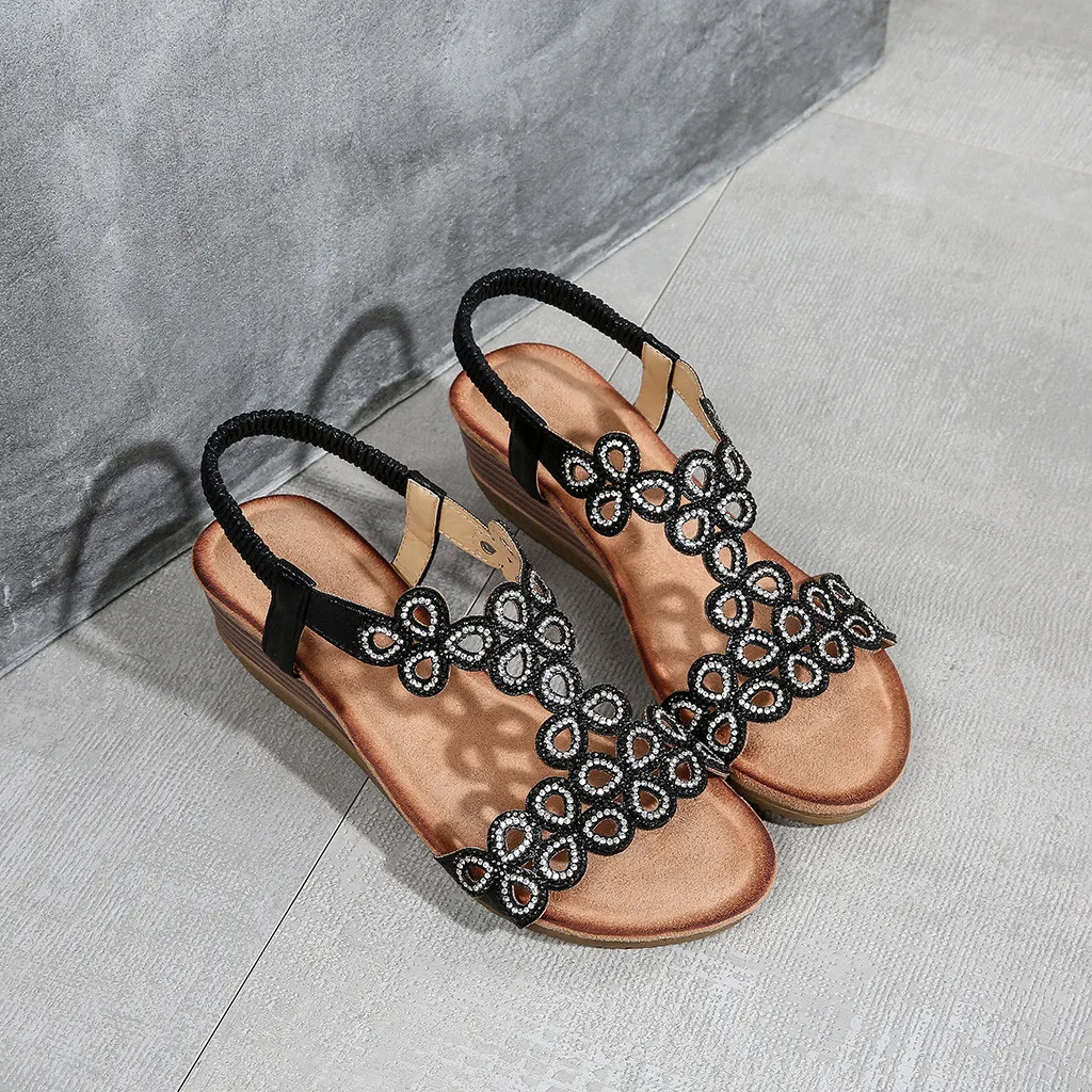 Женская обувь со стразами; повседневная обувь на танкетке с эластичным ремешком; пляжная обувь в богемном стиле; сандалии