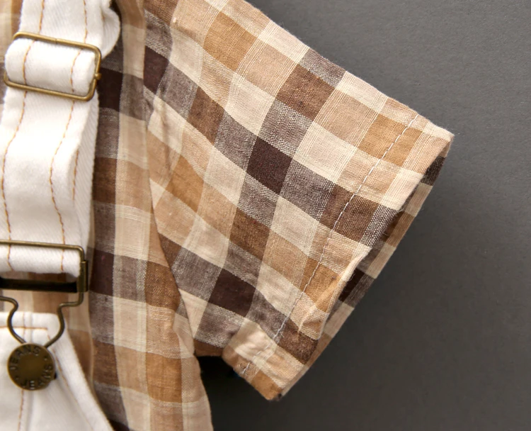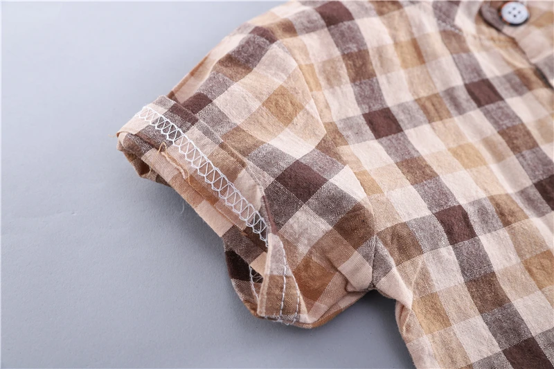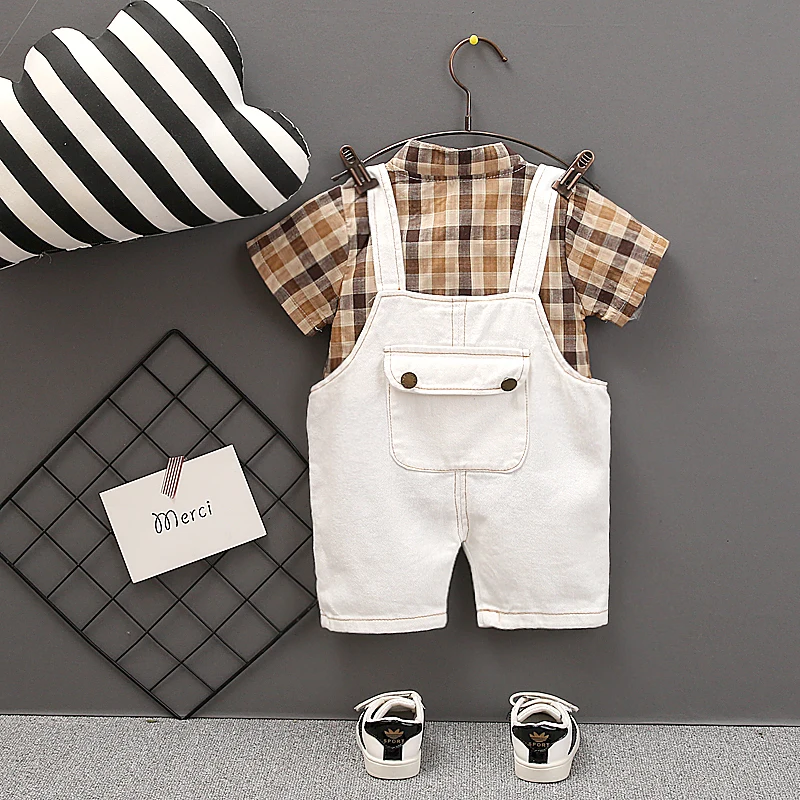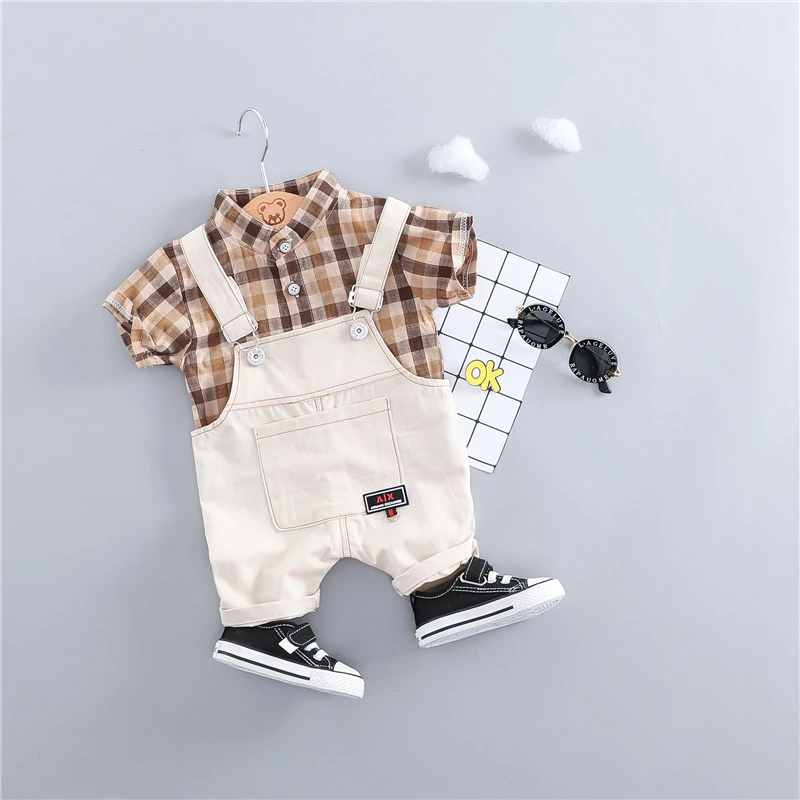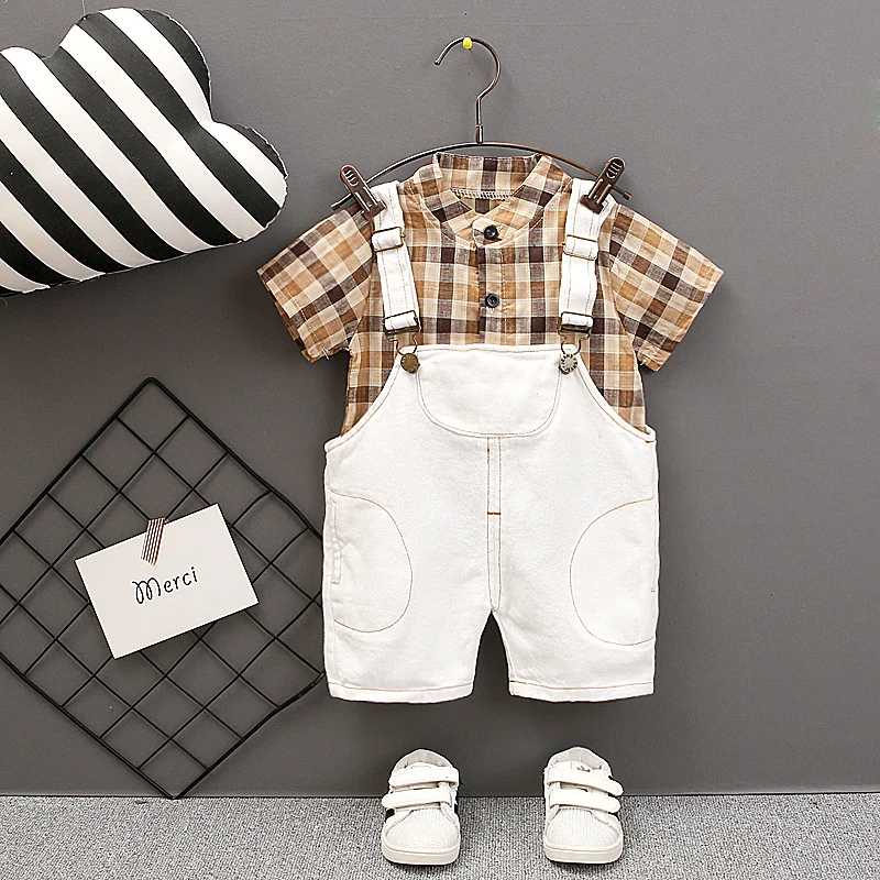 Модная летняя одежда для малышей комплекты одежды для маленьких девочек и мальчиков рубашка в клетку комбинезон 2 шт./компл., Детский костюм, костюмы для От 0 до 4 лет