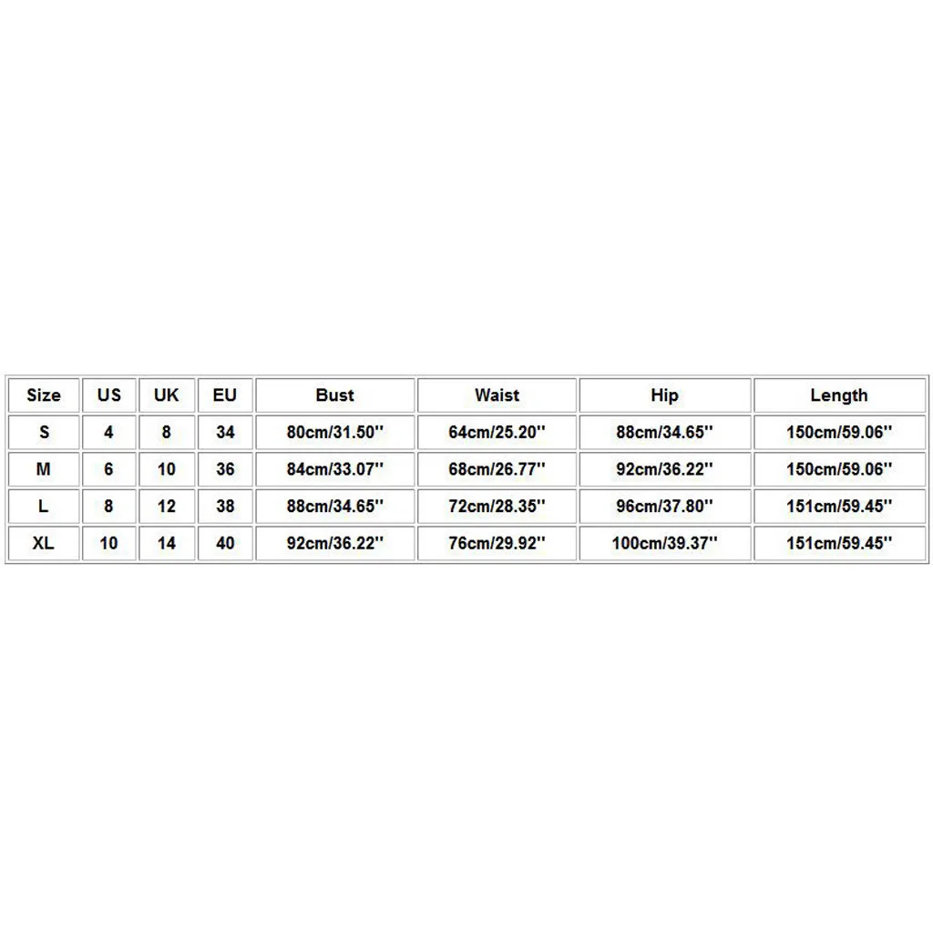 | Размеры: L | Свяжитесь с нами: 8 | UK:12 | ЕС: 38 | Обхват груди: 88 см/34,65 дюйма | Талия: 72 см/28,35 дюйма | Обхват бедер: 96 см/37,80 дюйма | Длина: 151 см/59,45'' |