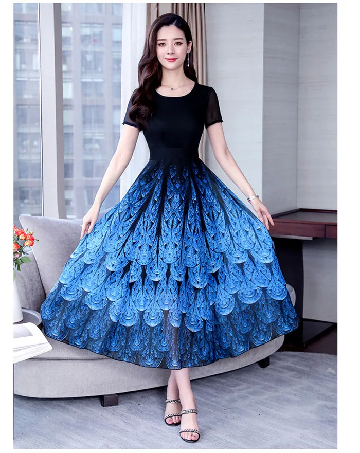 Летняя женская одежда Новые Элегантные шифоновые платья Платье с принтом павлина большого размера Модные уличные офисные женские Vestido OK891