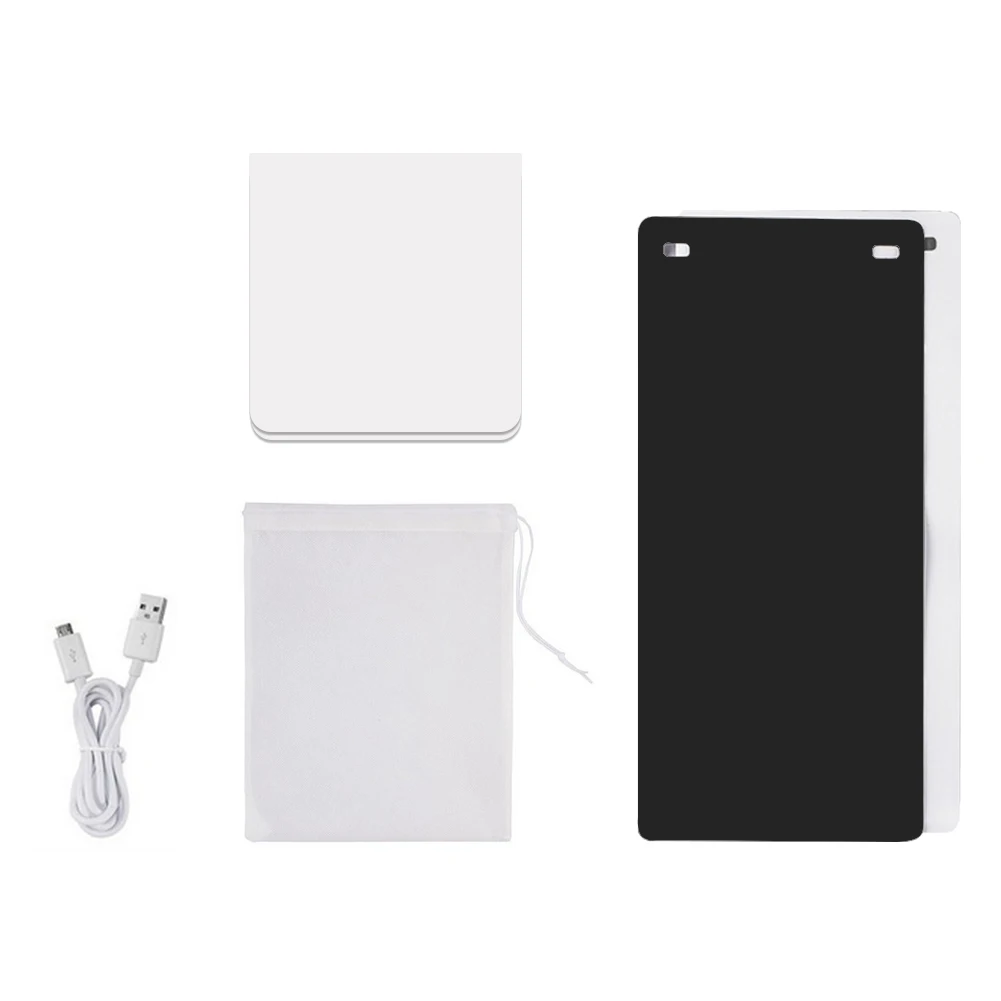 Внимание 1.Он нуждается в некоторой прочности, чтобы вытянуть «стену», когда установите его в первый раз, не волнуйтесь, ПВХ доска Достаточно жесткая, чтобы оторвать. И вы обнаружите, что «нестабильный» при подключении, бакаус доски с сильным «эффектом Памяти», это знания о физике. Вытяните стену снаружи с некоторой прочностью, как 120°~ 170°,Это быстрый способ снять напряжение. Затем вы обнаружите, что легко связать и сделать правильный угол (90°). 2. Возможны отклонения в размере от 2 до 5 мм из-за ручного измерения. 3. Не включает настенное зарядное устройство, найдите ноутбук, внешний аккумулятор, зарядное устройство смартфона в качестве источника питания. Посылка в комплекте 1 х мини студийный тент