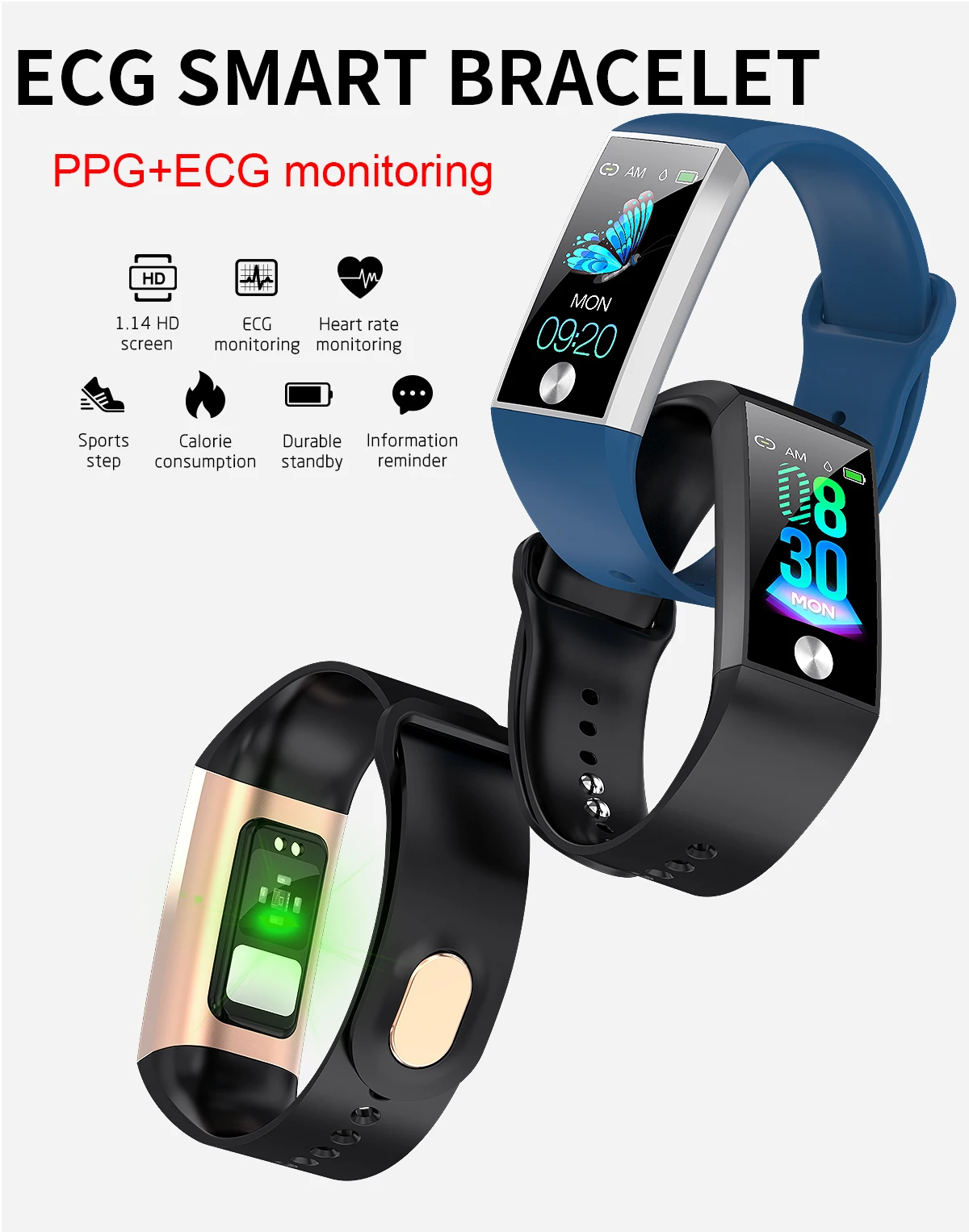 Цветной экран 1,14 'PPG ЭКГ, пульсометр, кислородный монитор, водонепроницаемый браслет, спортивный ЭКГ, новинка 2019