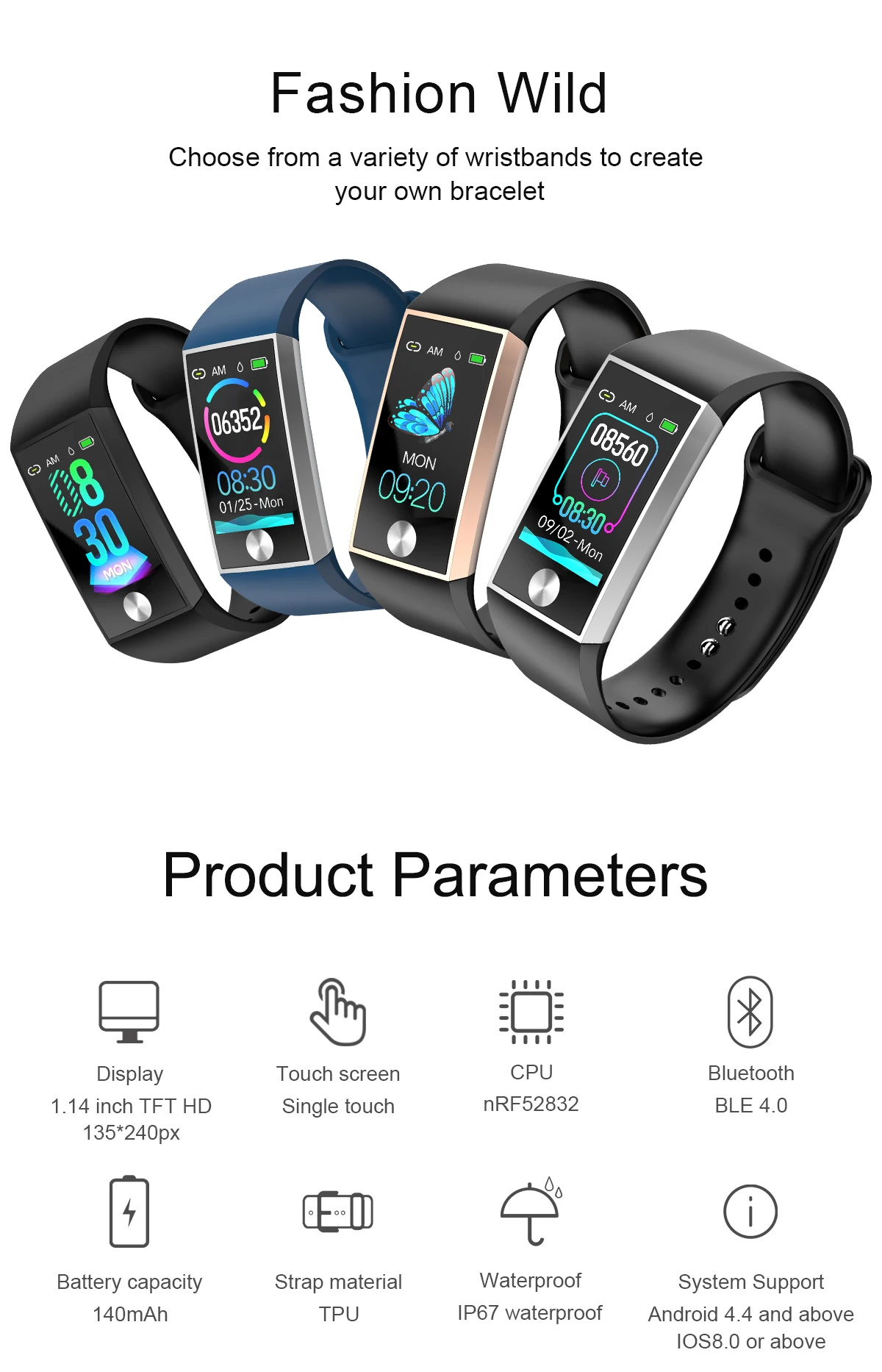 Параметр: Чип (MCU) :NRF52832 Флэш-память: 512KB Память: 64 М бит G-SENSOR: ПЗУ KX023-1025 AFE:Silicon Labs SI1182 IC управления зарядкой: Core force micro CE3156A420 Параметры зарядки: 5 В -- 300 мА ~ 2000 мА Яркость дисплея: регулируемая Системные требования: Android 4,4 и выше, IOS 8,0 и выше Версия Bluetooth: BLE 4,0 Дисплей экрана: цветной экран браслет (1,14 дюймов TFT LCD. Разрешение 135*240) Емкость аккумулятора: 140 мАч Язык поддержки приложения: упрощенный китайский, традиционный английский, японский, корейский, немецкий, Грамматический, португальский, испанский, итальянский, русский и вьетнамский Время работы в режиме ожидания: 25-30 дней Время работы: 4-5 дней Ключевая точка: Емкостное касание Встроенный Двигатель: напоминание о вибрации Антенна: Bluetooth Интерфейс зарядки: режим зарядки зажима (положительное и отрицательное направление) Класс водонепроницаемости: класс водонепроницаемости IP67, защита от пыли, защита от пота, стирка лица не повлияет на нормальное использование ручных колец Спецификация и функции: Цвет: силиконовый ремешок (черный с черным серебром с черным золотом с красным с серебристым с синим) ремешок может быть подобран в соответствии с требованиями заказчика. Цветной экран браслет 1,14 дюймов TFT LCD. Разрешение: 135*240 Основные рабочие функции: Подключение по Bluetooth/отключение низкой точки/зарядное устройство/настройки пароля/обновление прошивки и восстановление заводских настроек/Поиск/Секундомер/Обратный отсчет/Будильник для напоминания о приеме звонящего (бесшумный режим отказа)/дисплей питания Стандартные функции упражнений (подсчет шагов, расстояние, калории, кровяное давление, пульс PPG, мониторинг сна, ЭКГ пульса) Напоминание о сидячем положении Напоминание о отключении Bluetooth Напоминание для достижения целей движения Общая функция (обнаружение ношения и привязка оборудования пульт дистанционного управления Фотография основной интерфейс стиль Настройка запястья-поворотный яркий экран функция переключатель состояние по умолчанию) Уведомление о звонках (может отображать контакты), уведомление о сообщениях (может отображать содержимое сообщения) QQ push, Wechat push, WhatsApp push, Skype push, Facebook push, Twitter push reminder, Line push reminder, linkedln push reminder lnstagram push reminder Snapchat push reminder Gmail push reminder SMS push reminder другие приложения push Автоматическое переключение на 12 часов/24 часа Обновление функции прошивки в Air OTA Синхронизация данных с приложением Режим загрузки приложения/APK: (Android может искать H Band на рынке приложений Android и загружать и устанавливать его напрямую) (Apple может искать H Band в App Store и загружать и устанавливать его напрямую.) Загрузите и установите двумерное сканирование кода (H Band)