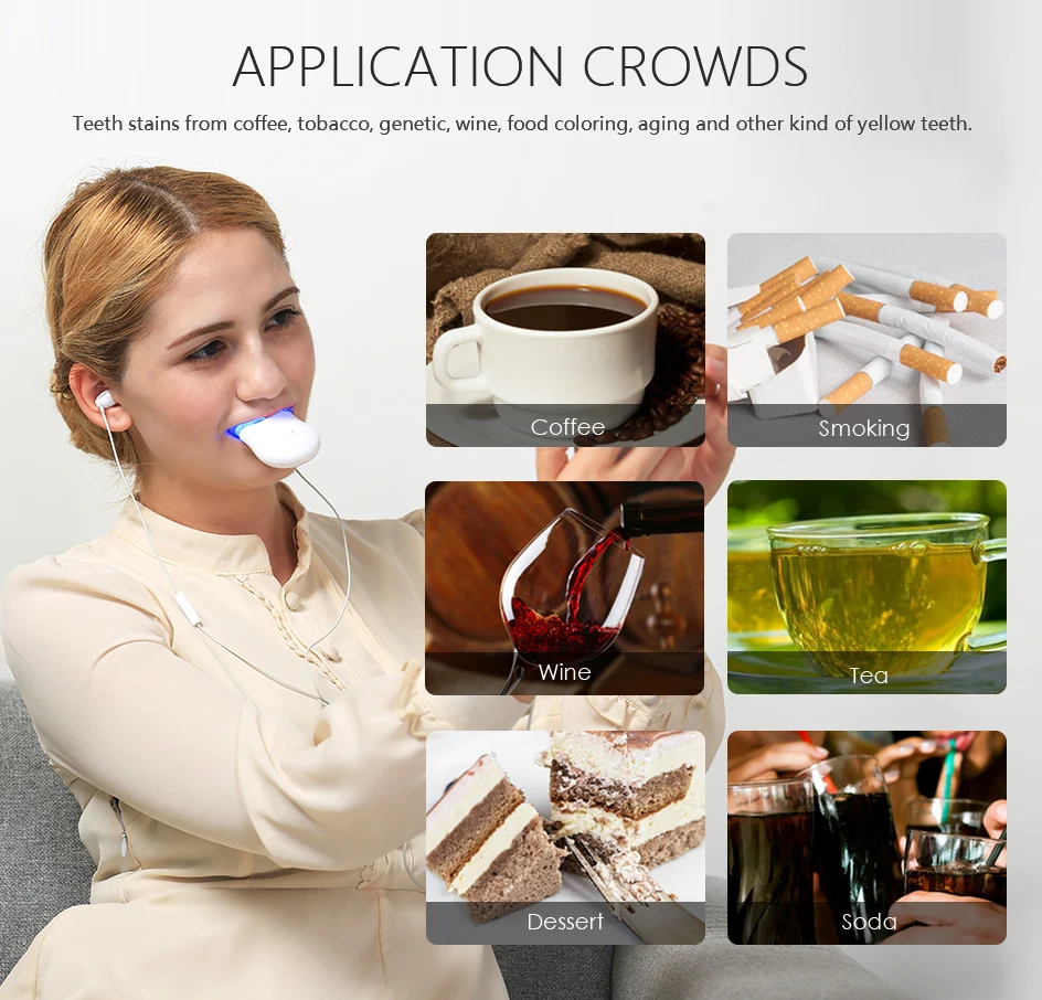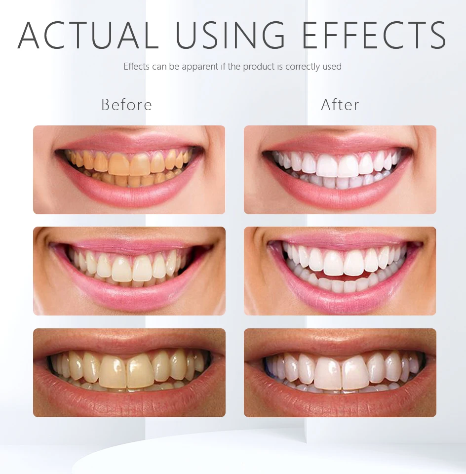 Примечание: Не ешьте темные продукты, такие как никотин, чай, кофе и красное вино в течение 24 часов после использования. Отбеливание не работает на тетрациклиновых пятнах (серый), имплантатах, коронах или винирах, натуральный желтый зуб может не работать.
