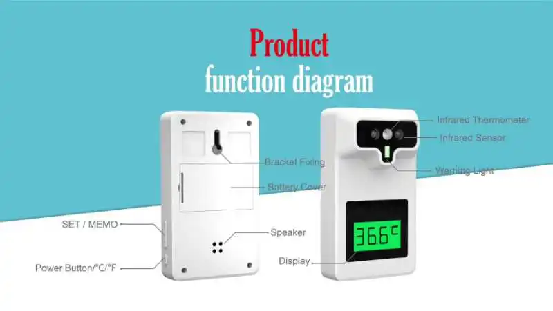 Аномальная Температурная сигнализация: если температура превышает нормальное значение температуры, Бесконтактный цифровой термометр будет отображать красный светильник и издавать звук, который даст вам знать, есть ли жар, В противном случае он покажет только зеленый светильник и его температуру