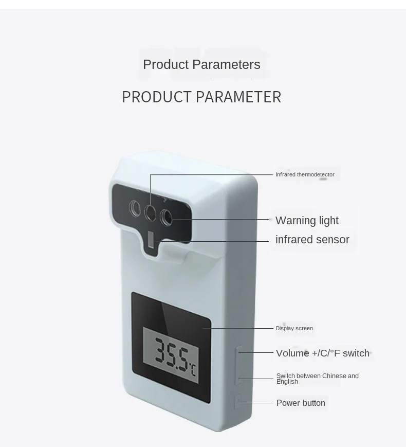 Описание: настенный Бесконтактный инфракрасный термометр может измерять температуру в пределах 2-4 дюймов от лба, более здоровый и безопасный. Когда температура превышает нормальное значение температуры, Бесконтактный цифровой термометр будет отображать красный светильник и издавать звук, который даст вам знать, есть ли жар, И эта температура может отображать показания по Цельсию или по Фаренгейту. Диапазон инфракрасного измерения: 0 ℃ ~ 50 ℃