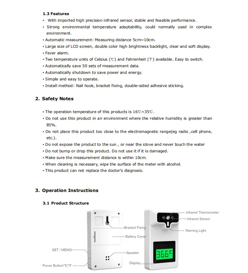 Прочная конструкция: термометр может быть отрегулировано в пределах 3-5 см/1,18-1.97in (примерно), который не требует никаких фиксированное измерение расстояния. И термометр отличается отличной долговечностью.