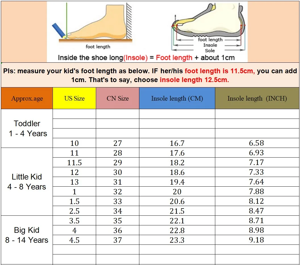 5.Что касается размера, Измерьте длину стопы ребенка в см или дюймах + 1 см или 0,03937 дюймаChВыберите соответствующий американский размер, спасибо