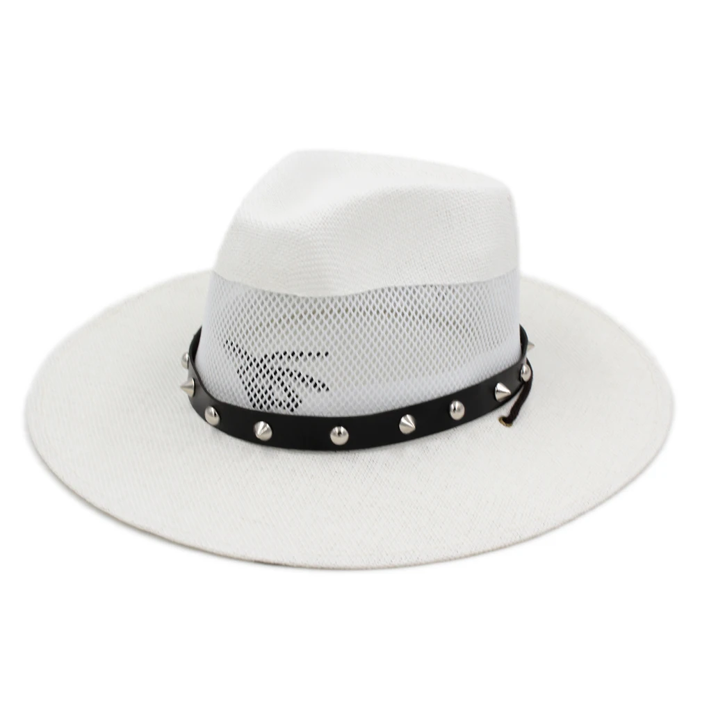 Изготовленная из 100% бумажной соломы, эта качественная летняя соломенная шляпа-обязательный модный аксессуар. Разнообразие однотонных цветов с заклепками черного цвета Кожаный ремешок Для завершения Вашего модного и уникального вида. Высокое качество и вес, светильник с sweatband для дополнительного комфорта, когда он становится горячим.