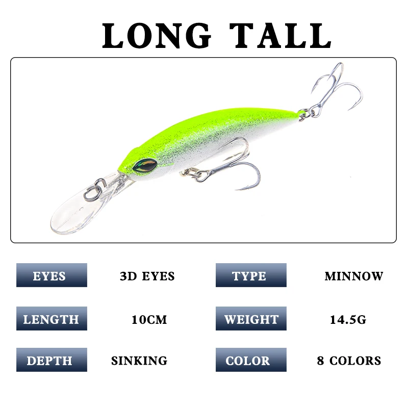Блесна рыболовная приманка 100 мм 14,5 г медленно тонет Crankbait жесткая приманка искусственные приманки окуня рыболовные снасти для ловли щуки XY488 Особенности: 1.3D глаза рыбы: 3D моделирование глаза, более привлекательный 2. Прочные тройные Крючки: оснащены острыми крючками, более мощные, прочные 3. Красочное тело: дизайн моделирования, более привлекательный для рыб 4. Более прочные сплит-кольца: используется конструкция высокого давления, увеличивающая площадь физической силы, она более прочная, чем обычное железное кольцо Технические характеристики: Тип приманки: Рыболовная Приманка Minnow Масса блесны: 14,5g/0,51 oz Длина приманки: 100 мм/3,94 дюйма : Материал подошвы: полиуретан толщина медленно опускается на дно Крючки: 2 * прочные тройные Крючки Глаза: 3D рыбий глаз Кольца: Плоские Кольца Цвета: 8 различных цветов Конечная рыба: бледно-чаб, бас, пикс, желтый карп, китайский окунь, топовый культер В комплект входит: 1 * рыболовные приманки