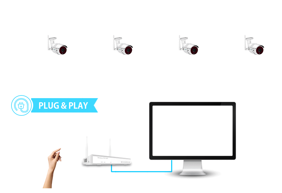 Система подключи и играй, ящик рекордера встроенный в маршрутизатор, все камеры wifi сигнал от видеорегистратора коробки, если Вы включите все камеры и рекордер, он будет работать правильно.