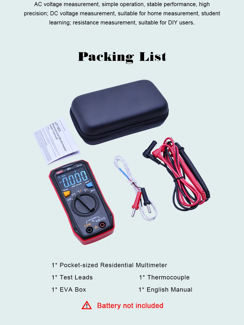 * Широкое применение,Измерение напряжения переменного тока, простая работа, стабильная производительность, высокая точность; Измерение напряжения постоянного тока, подходит для измерения дома, обучения студентов; Измерение сопротивления, подходит для пользователей DIY.