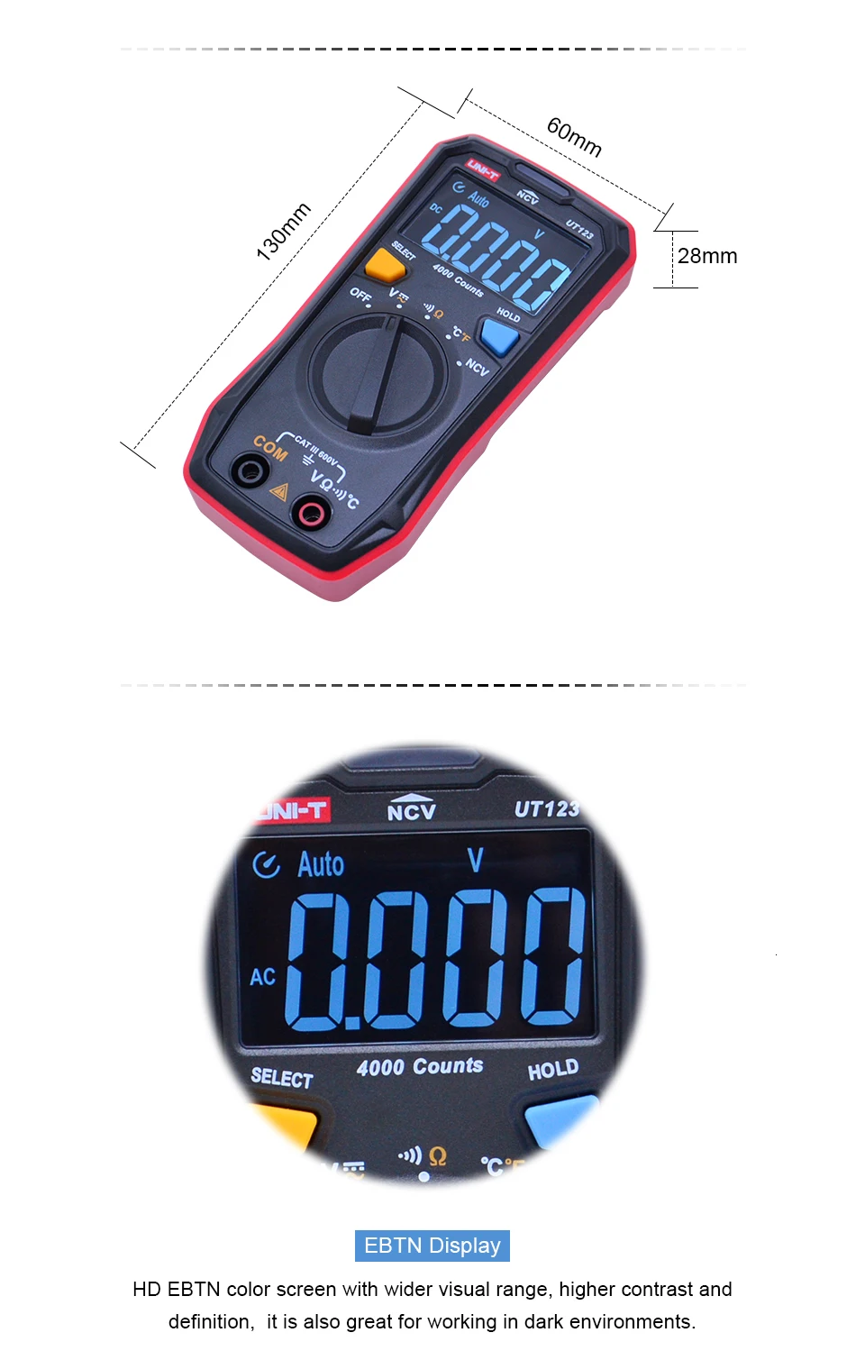 * Дисплей EBTN:Цветной экран HD EBTN с более широким визуальным диапазоном, более высокой контрастностью и четкостью, он также отлично подходит для работы в темных условиях.