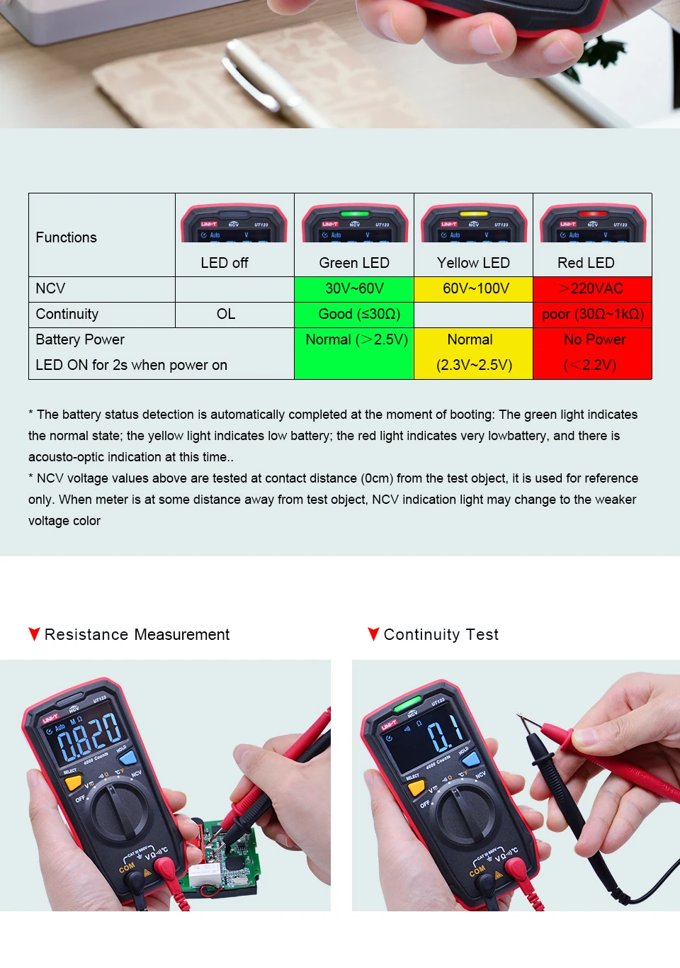 | Низкая Батарея индикация: ≤ 2,7 V | Акусто-Оптическая Индикация (NCV/непрерывность/питание батареи) | ||