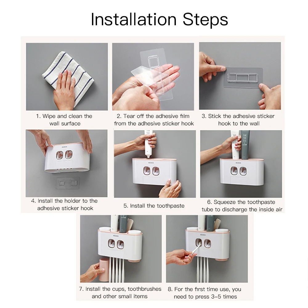 Держатель зубной щетки, который сочетает в себе с дозатором зубной пасты в одном теле, который является лучшим выбором для вашей ванной комнаты. Он защищает ваши зубные щетки от пыльной и влажной пыли и сохраняет вашу ванную комнату аккуратной. Кроме того, это позволяет быстро, легко и аккуратно распределить нужное количество зубной пасты непосредственно на кисти, очень удобно и практично.