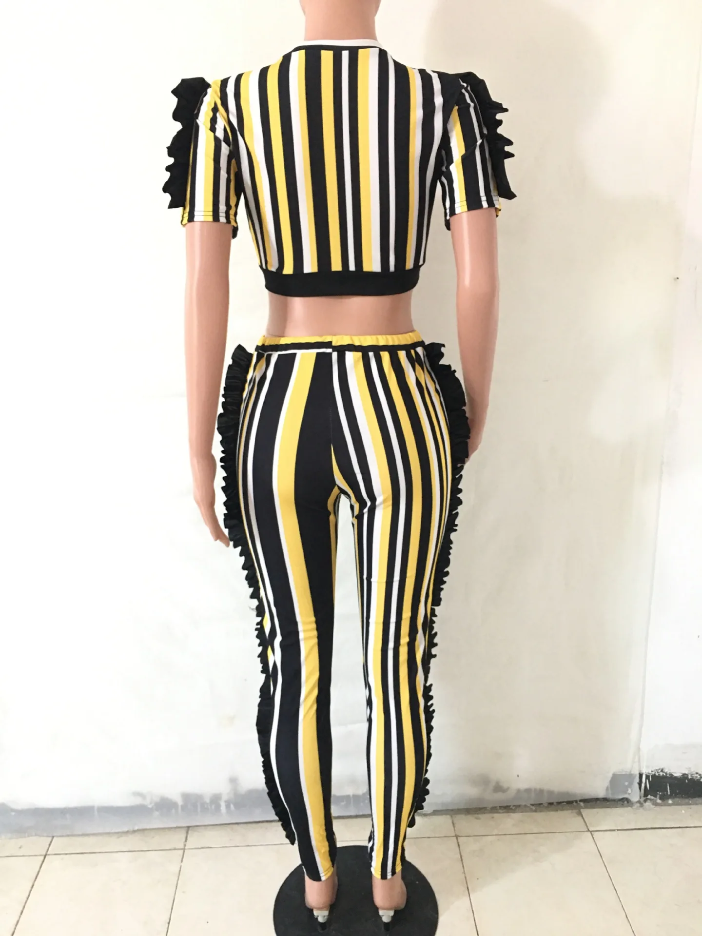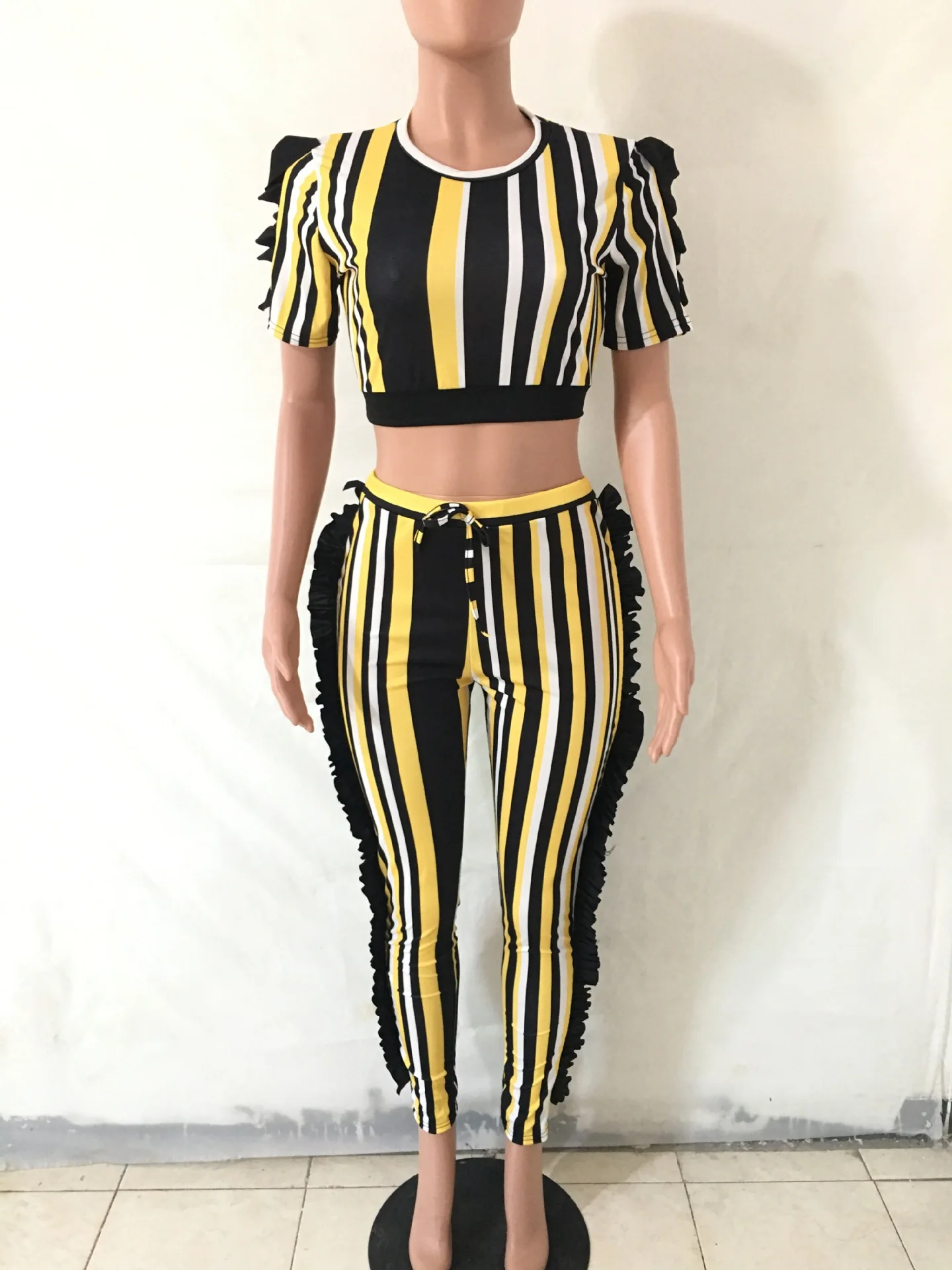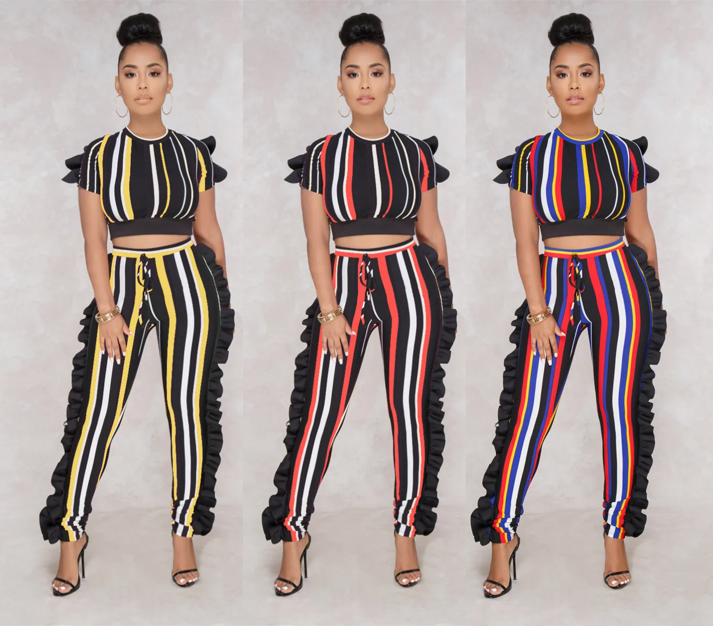 Распродажа, комплект из двух предметов в разноцветную полоску с оборками, радужный укороченный топ с короткими рукавами, брюки-карандаш, спортивный костюм, костюмы для отдыха